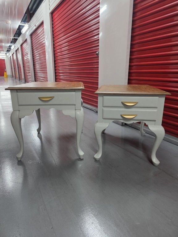 Bring charm and elegance to your space with this beautifully refreshed pair of Queen Anne end tables. Professionally refinished in a soft, neutral light sage with a warm stained oak top. The gold half-moon pulls give them a clean, updated look while keeping a classic feel. Solid wood construction Two-tone refinished design Queen Anne cabriole legs Smooth, durable painted base Warm hand-stained wood tops Updated modern gold hardware Clean, lined drawers Smoke-free / pet-free environment Very sturdy and well-built Perfect For: ✔ Living rooms ✔ Guest rooms ✔ Airbnb/short-term rentals ✔ Entry or hallway styling ✔ Vintage-inspired, farmhouse, French country, or transitional décor 1 drawer table: 27x22x23 2 drawer table: 27x20.5x22