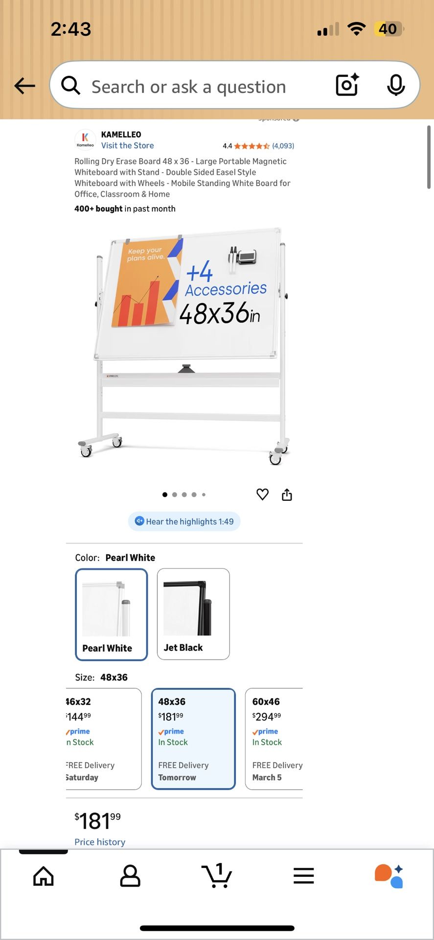 Dry erase marker on wheels. 48x36in. Great condition. I paid $181.99 + tax for it.