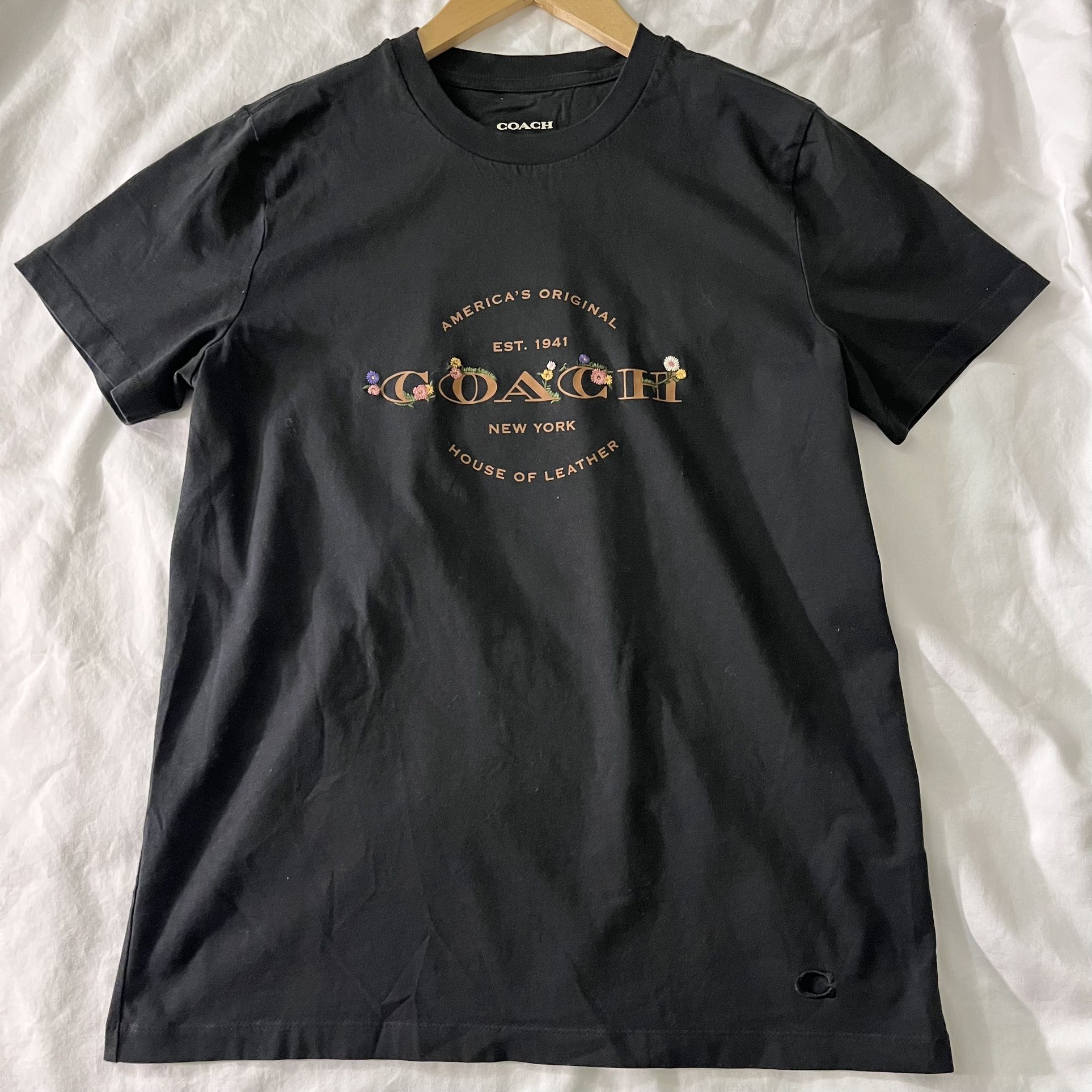 • Brand: Coach • Style: Short sleeve crewneck tee • Color: Black • Size: Women’s Small • Front Graphic:• “COACH” in large stylized letters with floral embellishments • Text reads: “America’s Original – Est. 1941 – Coach New York – House of Leather” • Material: Soft cotton blend • Details:• Embroidered “C” logo near bottom hem • Printed inner label Stylish and collectible Coach tee with heritage branding and floral accents. Great for casual wear or layering. Tags: Coach T-Shirt, House of Leather Tee, Women’s Small, Black Coach Shirt, Floral Logo Tee, Coach Graphic Top, Preowned Coach, Authentic Coach Apparel, Designer T-Shirt, Coach Est. 1941, Coach New York, Casual Luxury, Coach Heritage Shirt, Streetwear Fashion, Coach Logo Tee