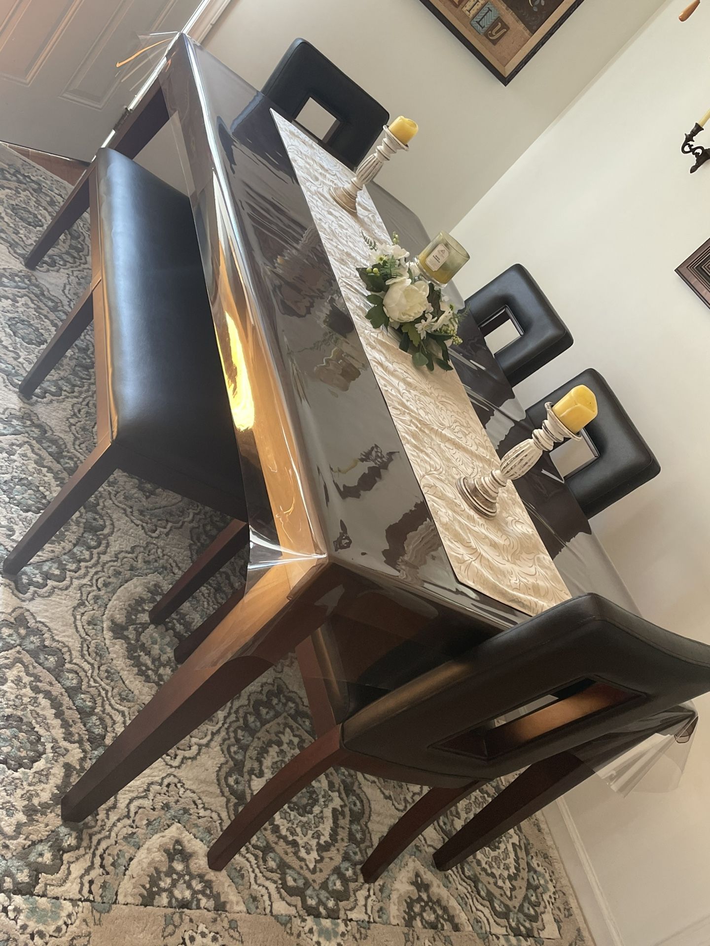 Dark brown and black dining table with 4 chairs and one bench Price is negotiable From Ashley