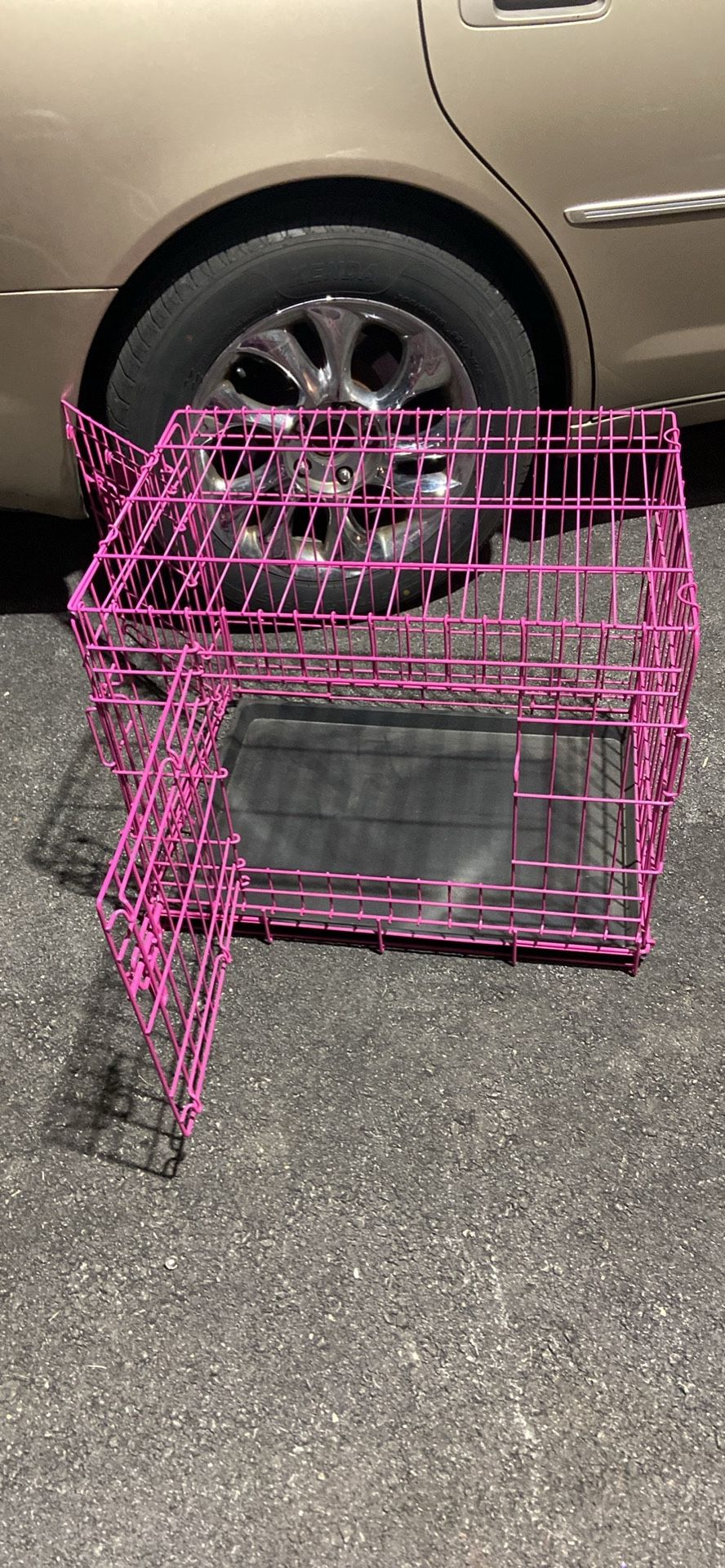 Hot pink with end door and side door. Both with lift and latch closures. Bottom slide out tray. Folds up flat for easy storage. Fits medium to medium large size animal. NEW!