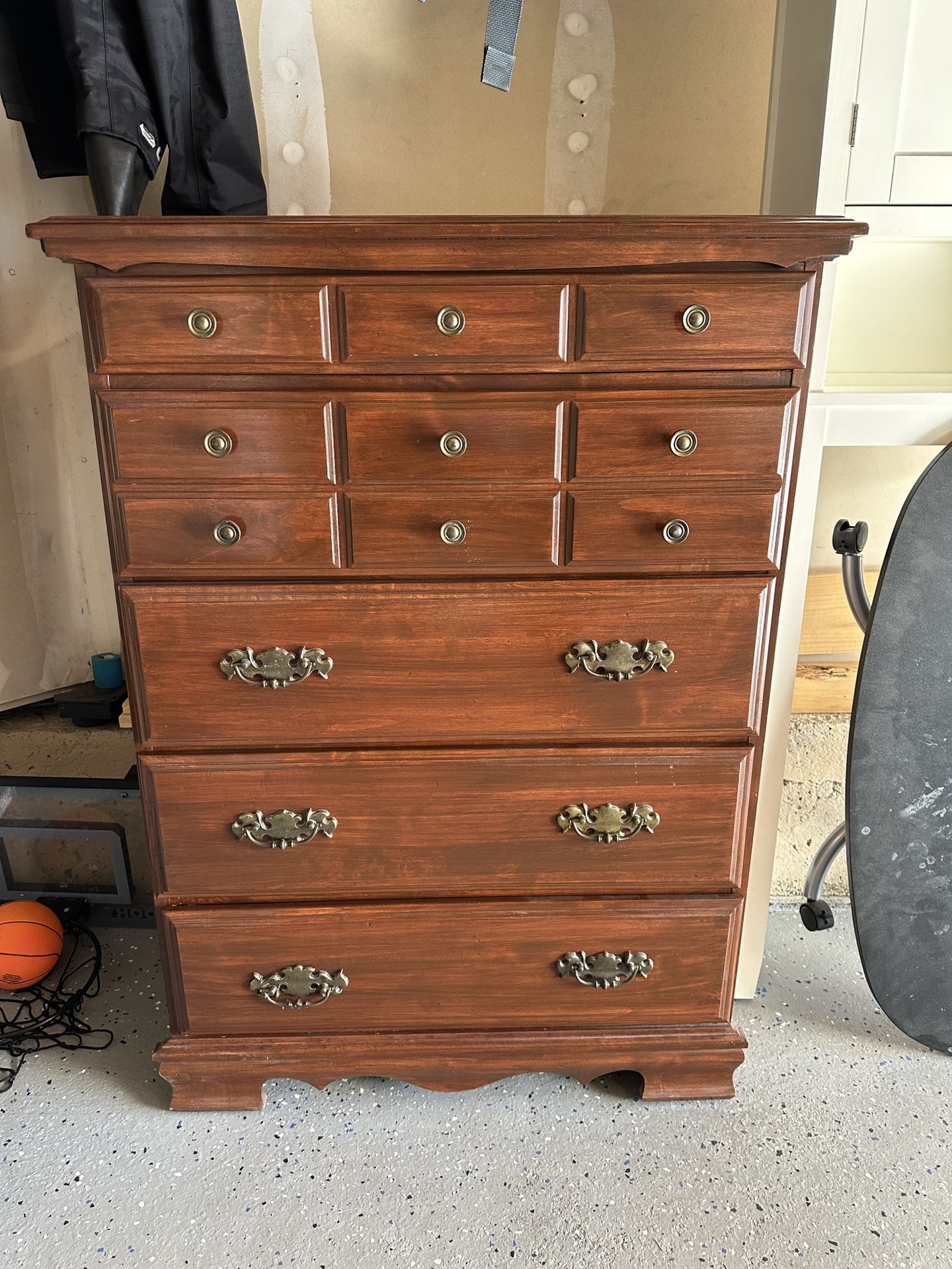 Five drawer, solid wood dresser.