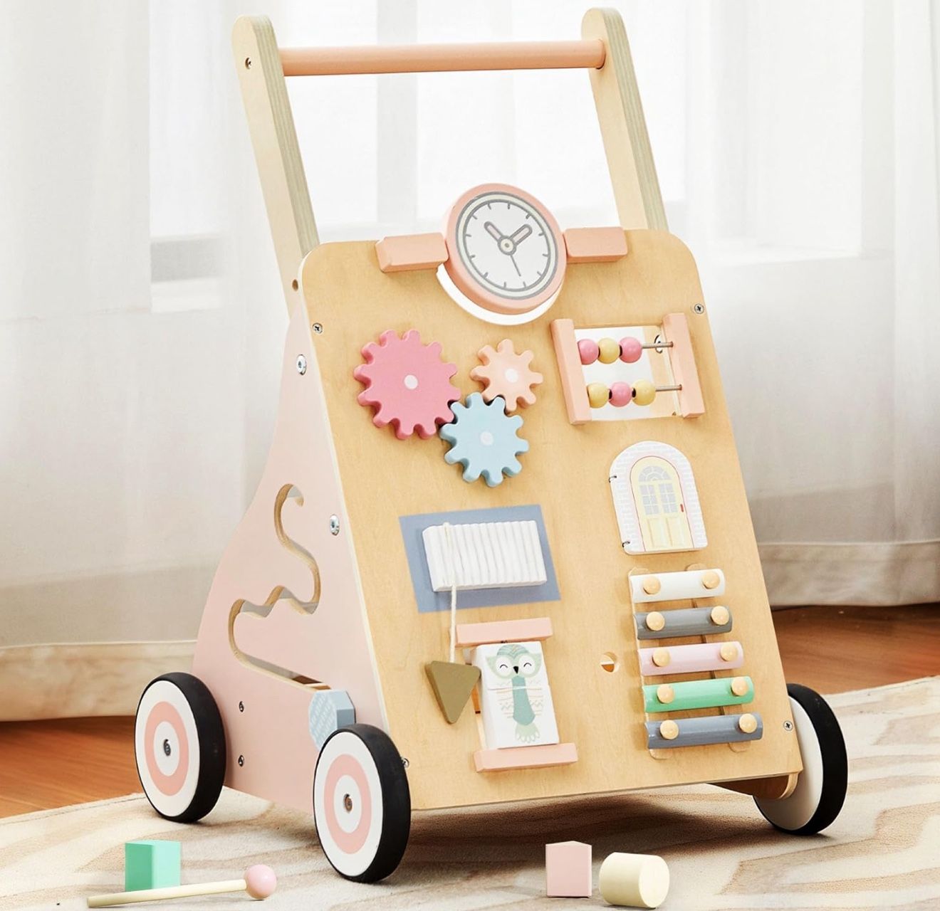 Wooden Baby Walker, Baby Push Walker with Wheels Multiple Learning Activity Center Baby Walker Adjustable Height and Speed for Girls Ages 9+ Months, Pink