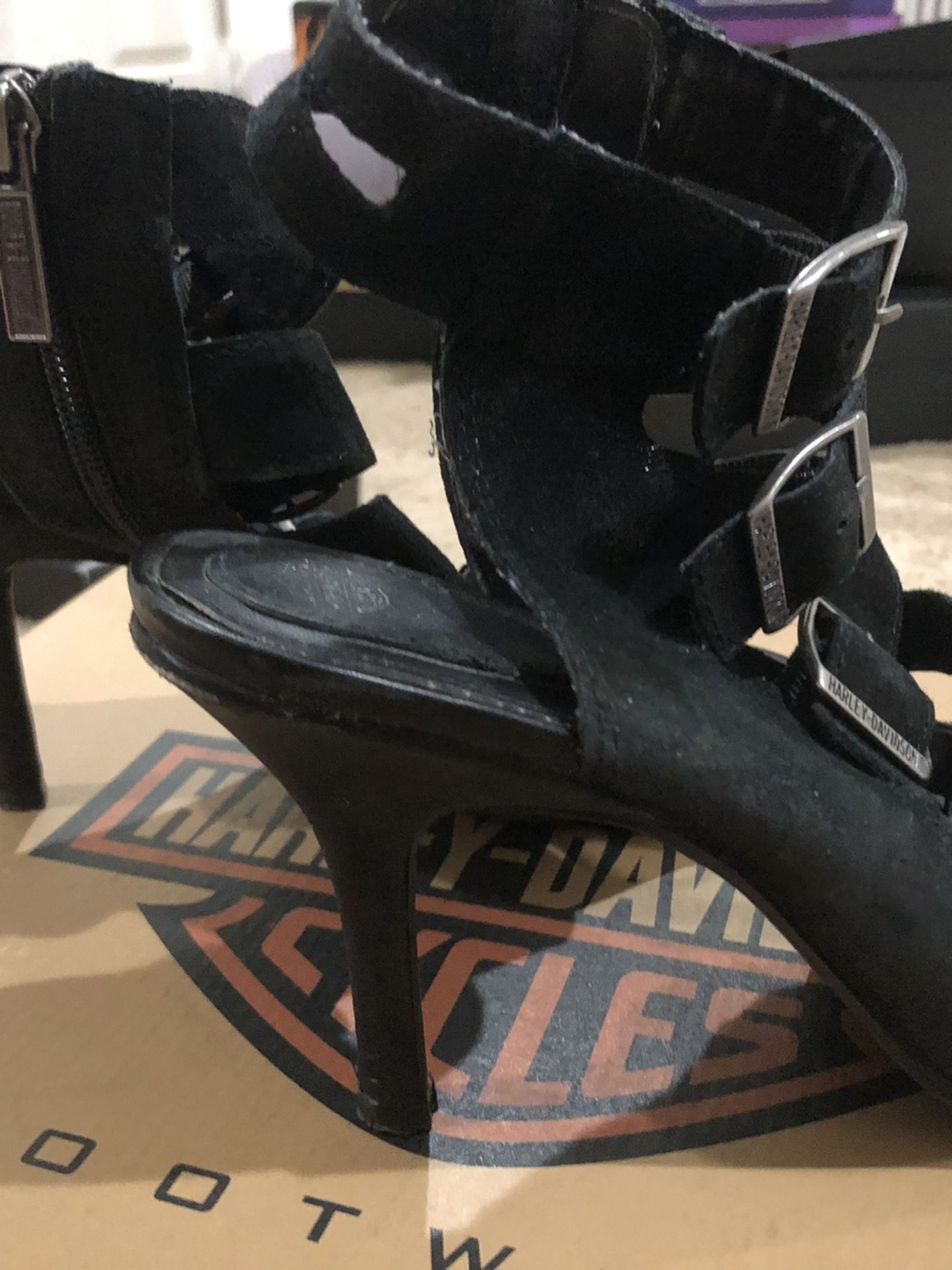 Harley Davidson motorcycle style shoes , great for your passenger ! Shiny leather with 5 buckles, heels stilettos, very slightly used after Harley ride parties but no any damage. Bought for $95