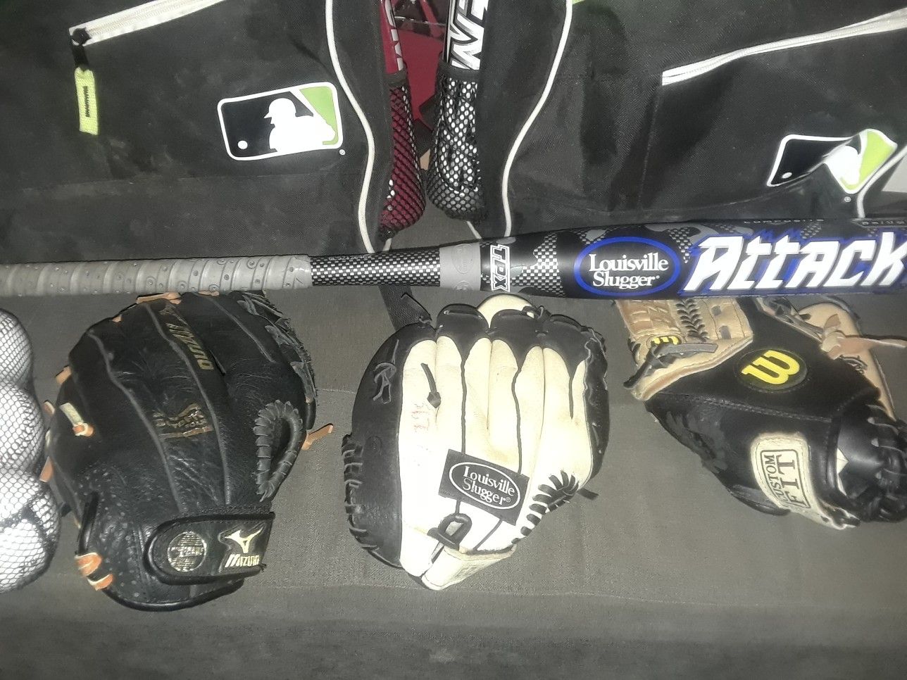 Louisville Slugger attack is a 29/20 DeMarini black coyote is a 29/20 DeMarini Rumble is a 28/18 Louisville Slugger Genesis is a 28/20 Louisville Slugger Genesis is a 27/19 2 franklyn 2 Bat holder backpacks Black Mizuno glove is a 11 and 1/2 inch Louisville Slugger Genesis glove is a 10 and a half inch Wilson custom fit glove is a 11/2 inch 6 new Rawlings baseballs