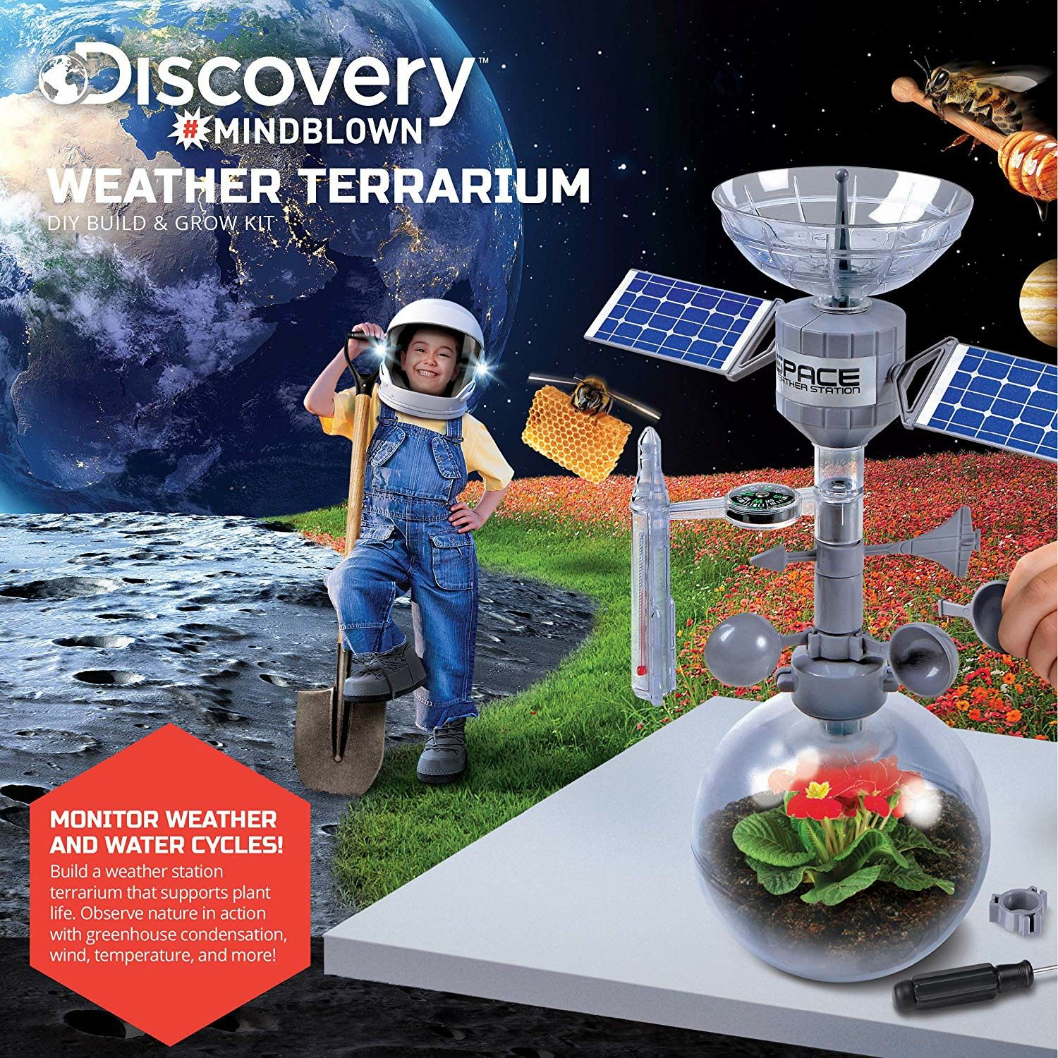 Brand new in a box Perfect for kids projects Build your own weather station Get ready to be a meteorologist with the Discovery Mindblown Weather Terrarium! The DIY mini weather station kit includes everything you need to build a weather station that doubles as a real terrarium! Grow plants in your terrarium The globe part of the weather station is built for growing and housing plants! The terrarium-style body is perfect for adding your own dirt and seeds so you can cultivate any plant of your choosing! (Plants and plant medium not included). Simulate and observe weather phenomena Use the weather station to simulate and recreate natural phenomena like the water cycle, wind directions, and temperature changes using the included equipment! Features: Build your own miniature weather station and terrarium Plant and grow your own plants in the terrarium’s globe Recreate and observe the water cycle’s phases Simulate weather indoors with temperature, wind direction, and more Package Includes: 2x Sprinkler pieces 3x Anemometer pieces 2x Weather vane pieces 3x Satellite pieces Thermometer 2x Thermometer support pieces 2x Rain gauge pieces Compass Compass stand 4x Wind collector pieces 5x screws Northern hemisphere globe piece Southern hemisphere globe piece 2x Faux solar panels Sticker sheet Marker Note: Plant seeds, soil, screwdriver not included but needed to assemble/complete set.