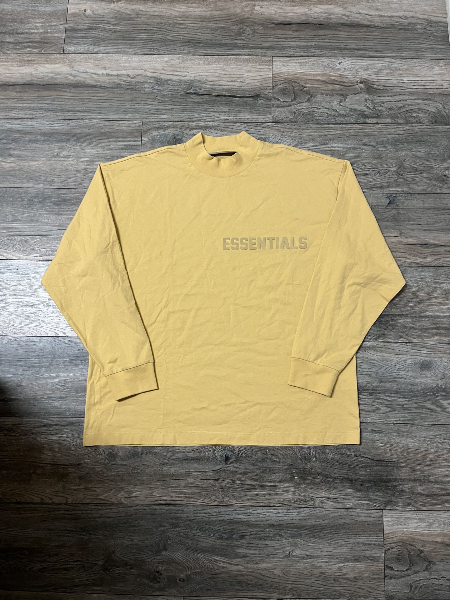 Fear Of God Essentials Mock Neck Long Sleeve T-shirt Mens Medium Yellow Summer This T-shirt is in used condition. Very lightly worn. There are no issues at all. There is a big front logo and a small back hit logo. No issues at all with those logos. The perfect summer shirt for any event. See photos for details. The measurements are 24.5” Pit to pit and 29.5” In length. The tag states size medium, but please keep measurements in mind before purchasing. Feel free to message me if you have any questions. Thank you!