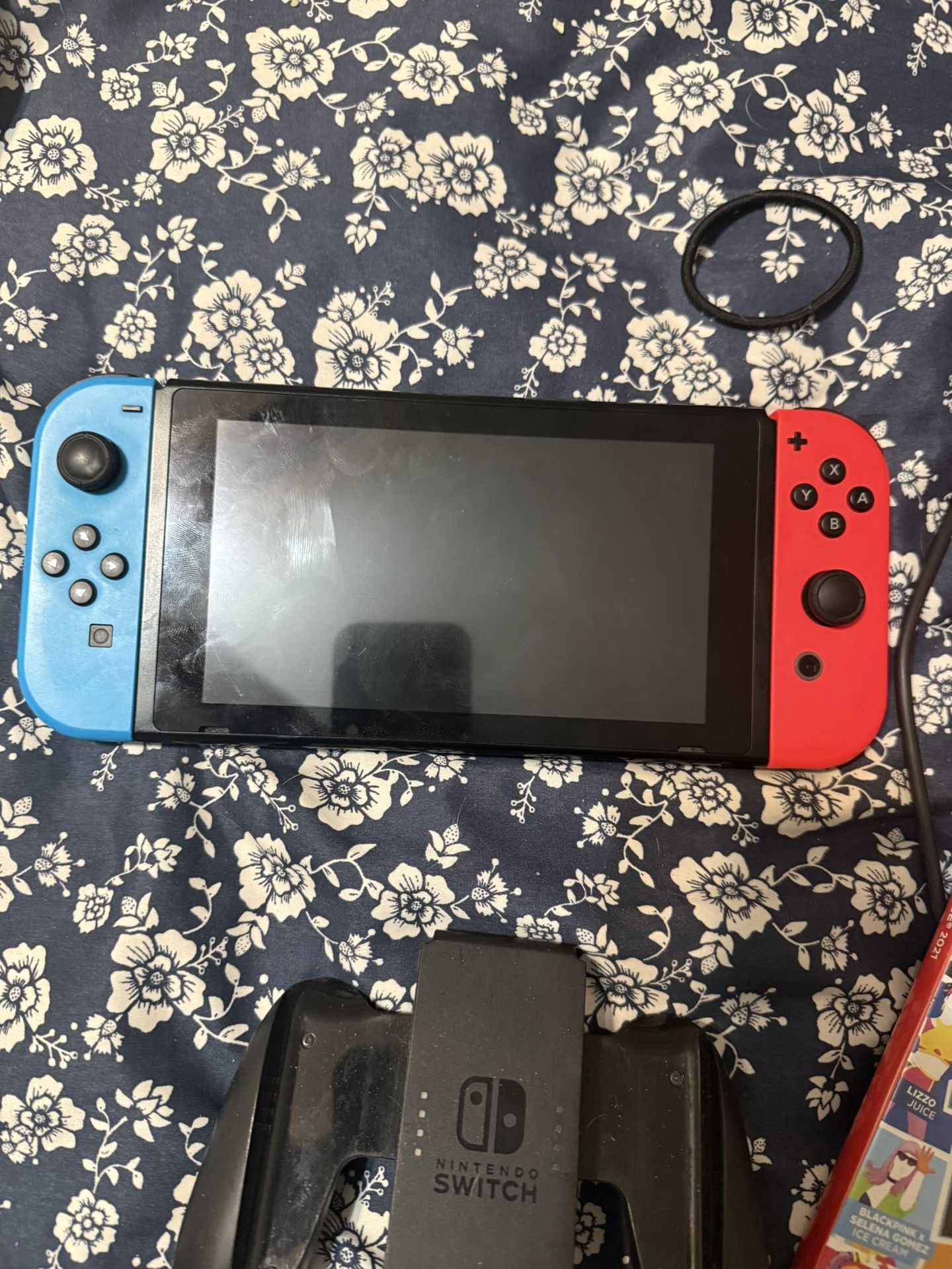 comes with 5 games as seen in pictures, dock, cable, and the controller holder works perfectly fine we just don’t use it at all