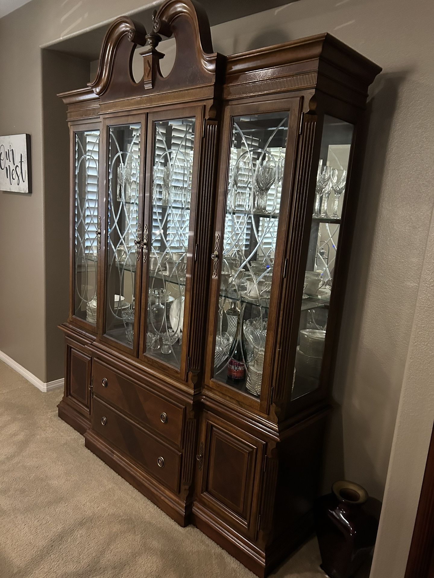 Dining room table, China set and chairs all for sale. Furniture in excellent condition. Used to decorate room, barely used. $450/ OBO