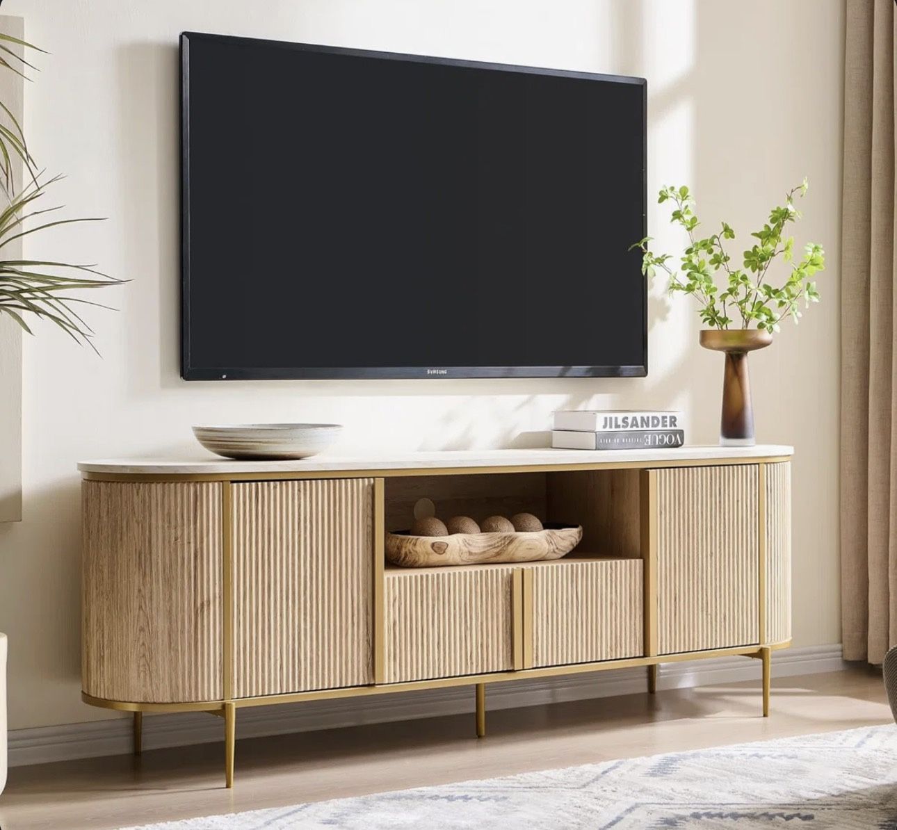 Features Features a curved design that can be paired with other modern or light luxury furniture styles. FUNCTIONAL ENTERTAINMENT CENTER: All shelves on the components could be adjustable to fit items from different heights that you need and offer customizable organization for media players, board games, and seasonal decor. With a large open shelf in the middle, you can easily organize your media devices, gaming consoles, DVDs, and other accessories. And 4 door cabinets provide convenient access while keeping everything neatly organized and clutter-free. Supports up to 150 pounds. DURABLE, WELL-FINISHED: Fluted panels are manufactured using blister molding techniques known for their high quality and consistency. The faux marble top is made of melamine veneer, which not only has a delicate texture, but also ensures long-lasting durability, water resistance and easy maintenance. And, the gold metal handles and cylindrical legs add to its contemporary vibe, creating a personalized and distinctive aesthetic. The interior of this TV cabinet is composed of manufactured wood. PERFECT DETAIL DESIGN: Three pre-punched holes for the cable management on the back panel allow you to organize those messy wires, it will keep your living room looking neat and also give it a homespun feel. The storage door uses soft closing hinges without any sound, and will not pinch the hand The exterior is crafted using a blister molding process, leaving no gaps. BUY WITH CONFIDENCE: Our clear assembly instructions and labeled parts make putting it together a breeze. We recommend having a second person to help with the smoother assembly process. The product will be shipped in sturdy boxes surrounded by thick foam and wooden protective panels to provide maximum protection from damage during shipping. Suitable for all decor styles, adding aesthetic to your living room and bedroom. With a hidden area on the back of the cabinet, you can easily manage cumbersome cables and keep your home space tidy and organised. Comes with detailed installation instructions and tools to make it easy to assemble and start your luxury living room experience. Note that the brown color you see is by design. Lighting and viewing angles can cause minor differences in how it appears. The color presented in brown is part of the intentional design concept. Due to different lighting conditions and personal perspectives, it may be slightly different in perception.