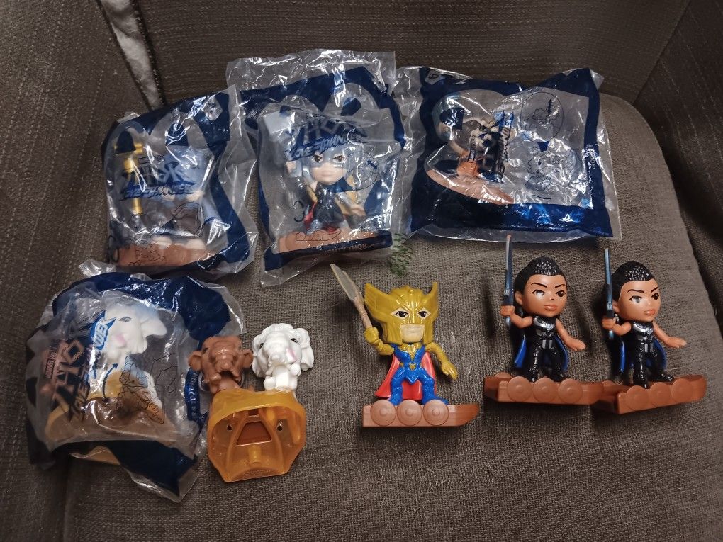 McDonald's 2022 happy meal Toys Thor Love and Thunder 8 figures Not a complete set Mighty Thor 1 (sealed), Golden Armor Thor 1 (opened), Rocket 1 (sealed), Korg 1 (sealed), Valkyrie x2 ( both opened), ToothGrinder and ToothGnasher x2 (1 opened 1sealed) Missing Thor, Groot, Star Lord, Mantis