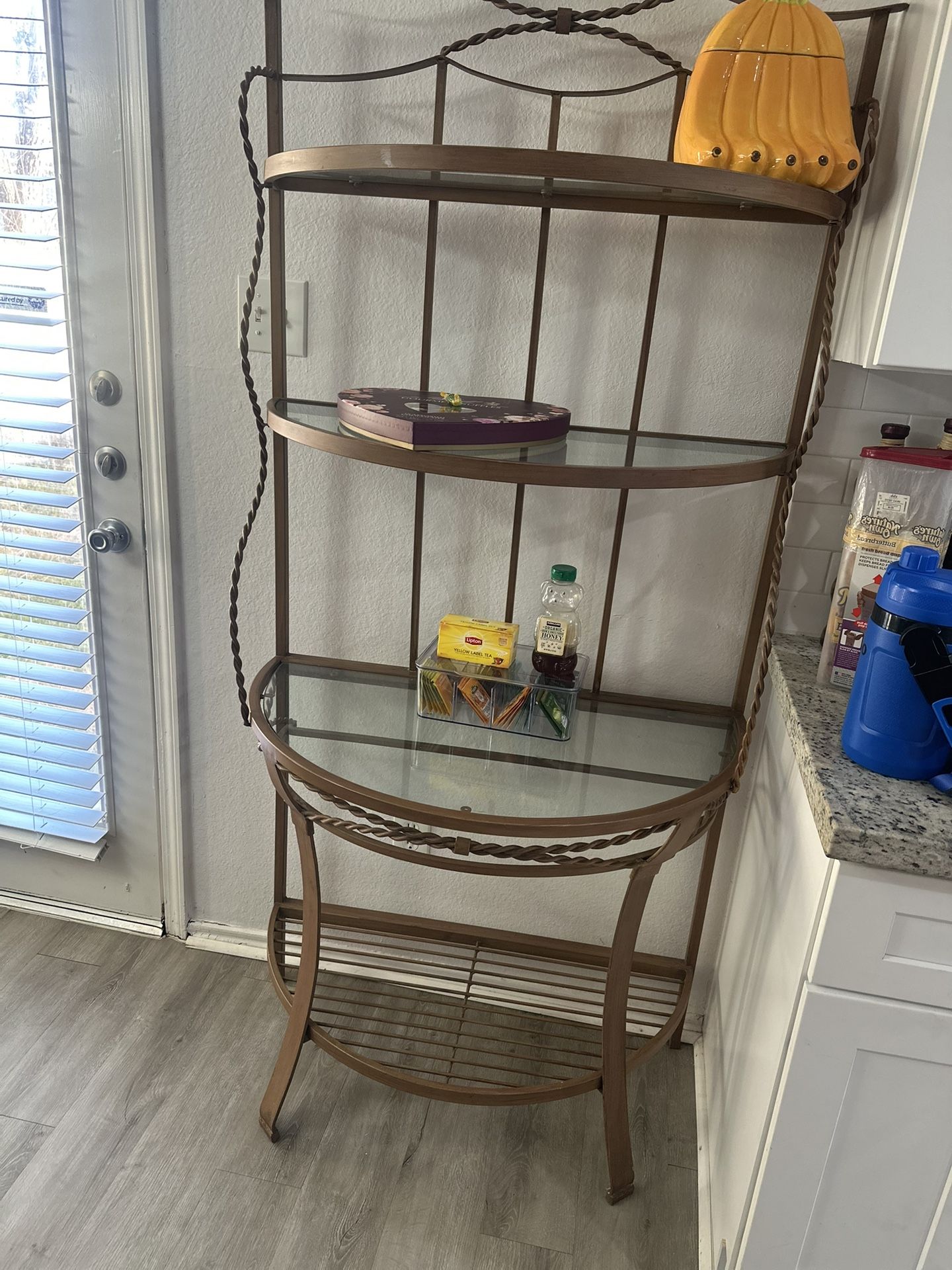 Elegant metal and glass shelving unit with four sturdy shelves. Great for décor, tea/coffee station, bathroom storage, or entryway display. Clean and in great condition.