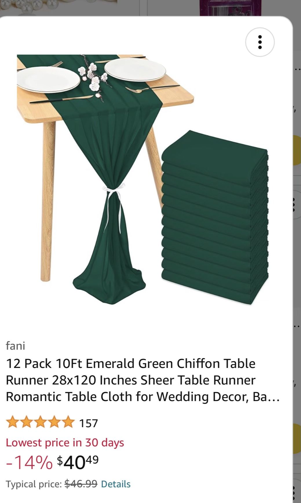 I have 2- 12 packs of emerald green chiffon table runner. Brand new never used.