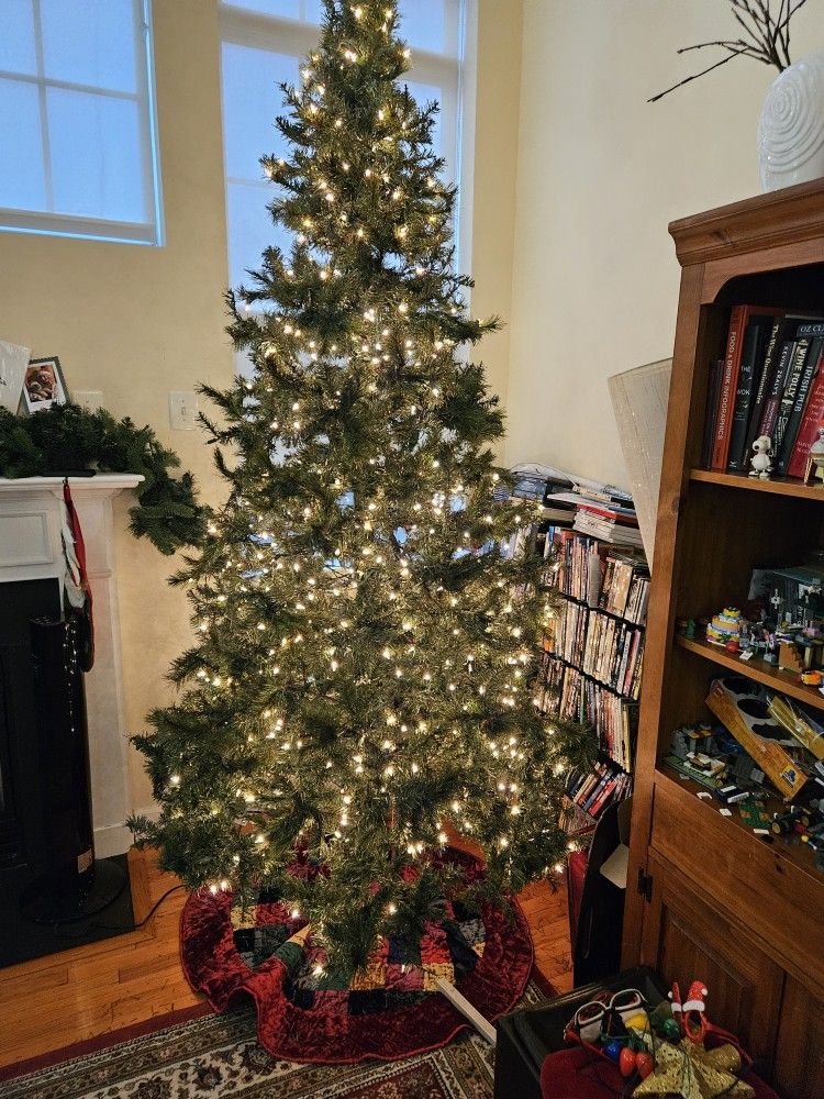 Splits into 4 parts. Works great. Traditional bulbs. 9 ft tree. White lights. All strands work