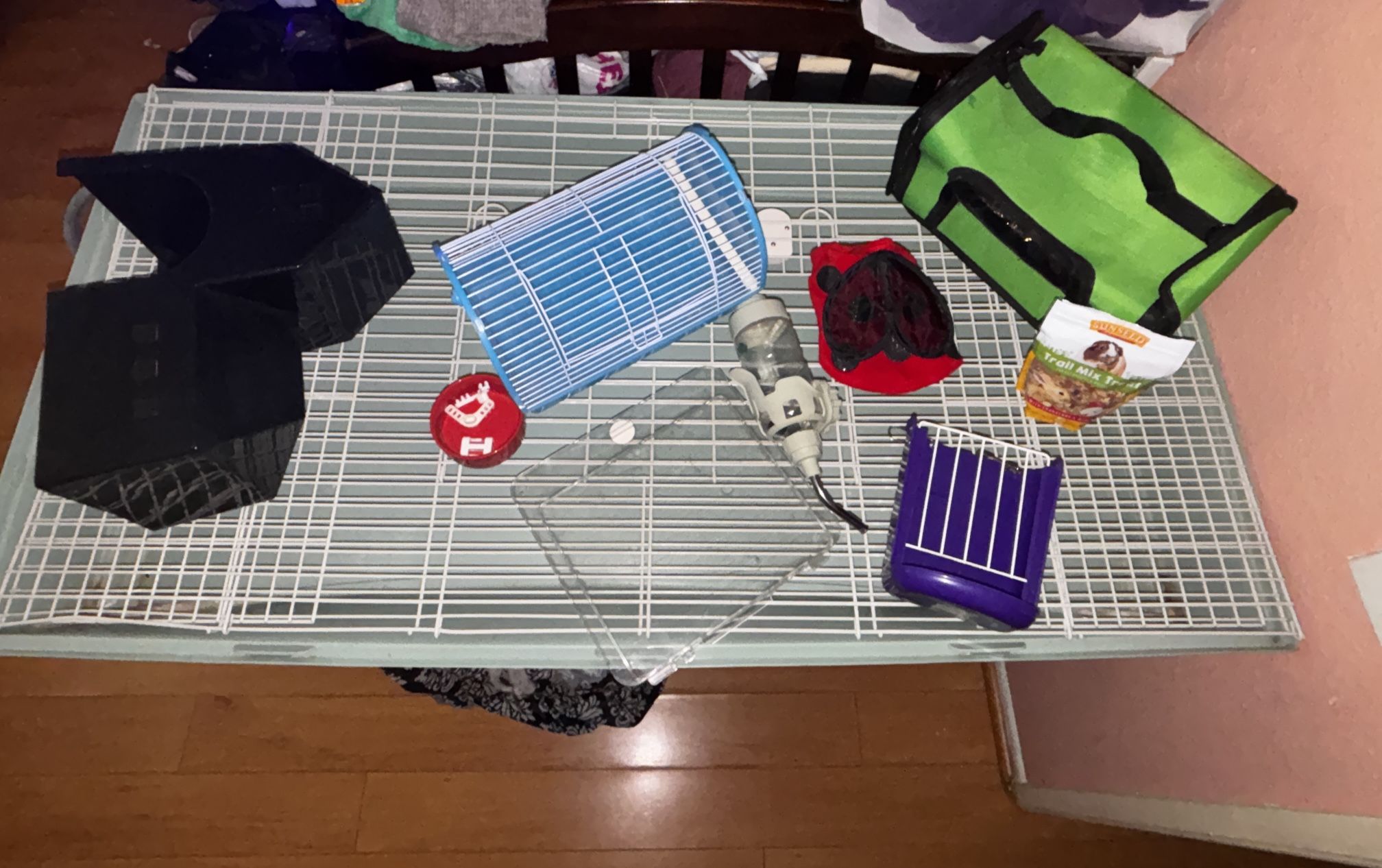 The cage is somewhat old with a few missing pieces overall functions good and is 52 inches wide and 25 inches in height comes with a pet carrier, pet house, pet bowl, water bottle hay feeder treats, ladybug costume for guinea pigs, another carrier, and food storage