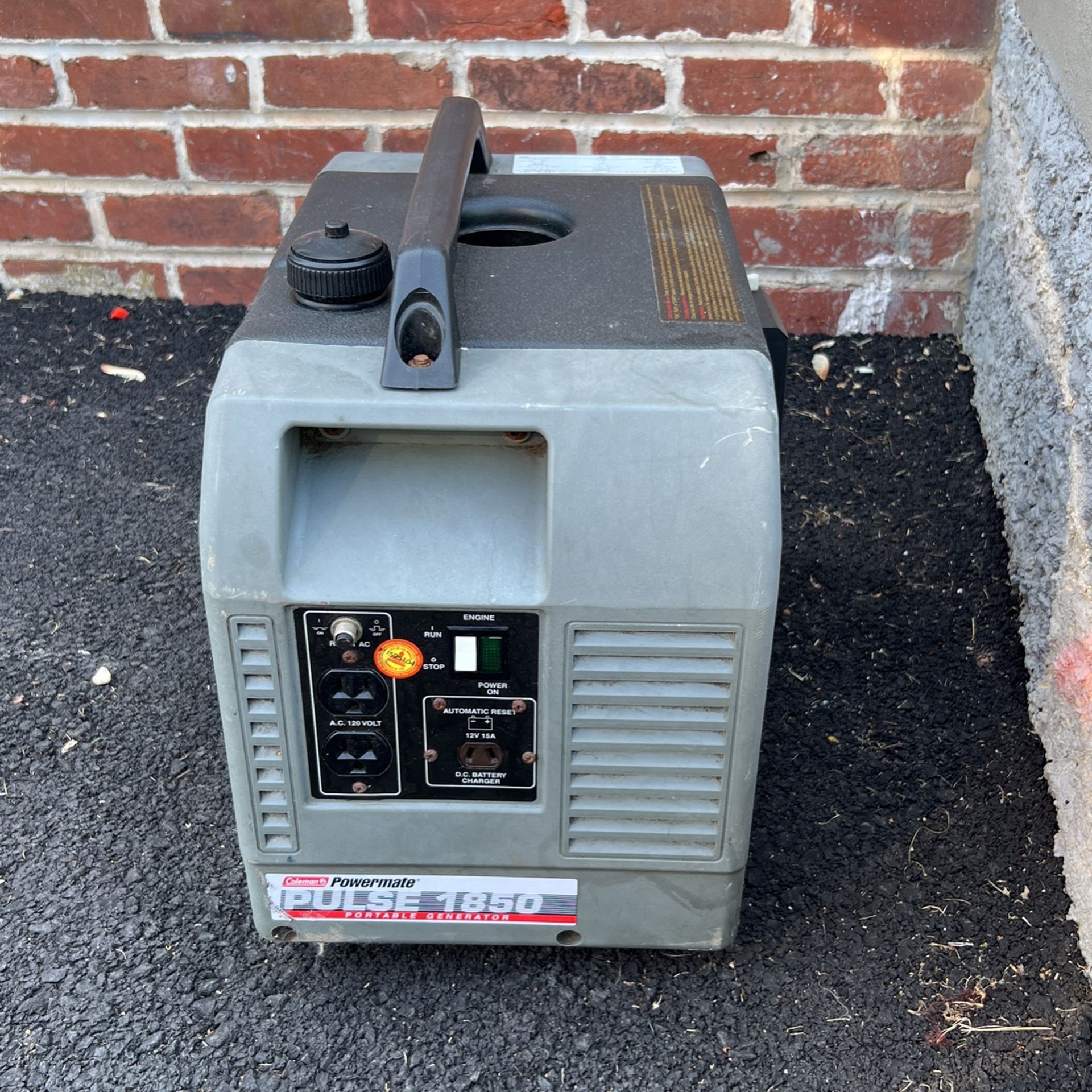 Good condition portable generator. Capacity 1850 two outlets. Power botton on and off. Generator starts on the first pull.