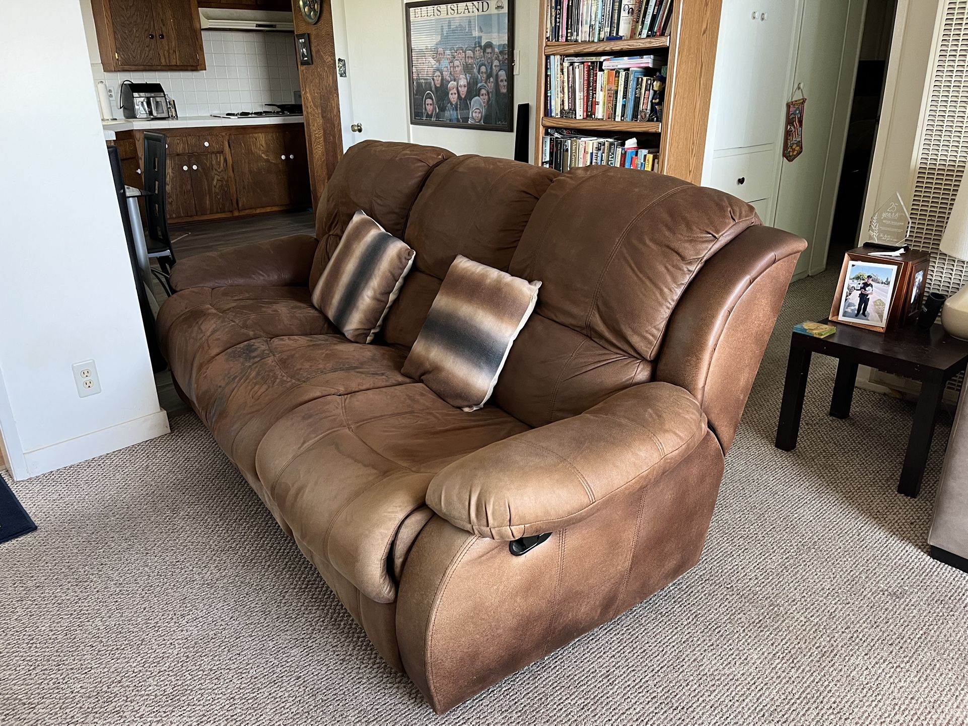 7 foot brown couch. Foot recliner. Good condition.