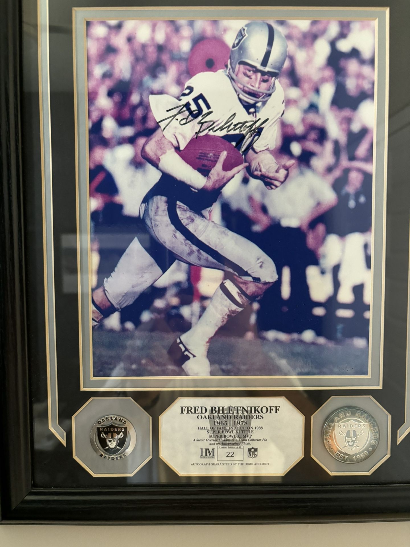Framed and authenticated 8x10 Fred Biletnikoff autographed photo. Certified by the Highland Mint. Includes silver overlay team collector’s pin. Includes certicate of authenticity.