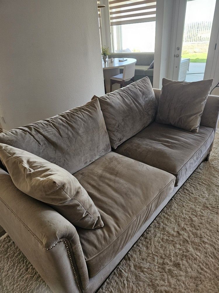 Sofas about about 6 years old. Comes as a set. Price for both! Only used in the formal room so gently used. It's a velvet/microfiber material. No rip or tears at all. Nothing broken. Comes from a non-smoking house. It's a jonathan louis bought at Mathis. Sofa: 84 long, 34 height, 40 depth Love seat: 60 length, 34 height, 40 depth I have a coffee table in another post as well.