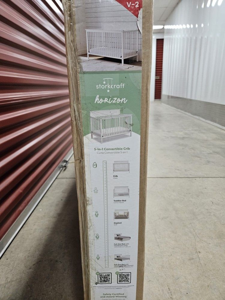 Storkcraft Horizon 5-in-1 Convertible Baby Crib white $145 Firm, New Pair your crib with the matching Horizon 3-Drawer Chest with Changing Topper and Horizon 6 Drawer Dresser. The Storkcraft Horizon 5-in-1 Convertible Crib is a versatile, classic crib designed to match any nursery style. Crafted from pine wood, poplar dowels and wood composites. The Horizon features a 4-position adjustable mattress support base to adapt to your growing baby. It also converts into a toddler bed, daybed, and full-size bed with headboard and optional footboard. The Horizon is certified safe. GREENGUARD Gold Certified - Screened for more than 10,000 chemicals and VOCs known to pollute indoor air. JPMA Certified - Expert tested by third-party, accredited laboratories to meet or exceed all applicable category safety standards. Mattress not included