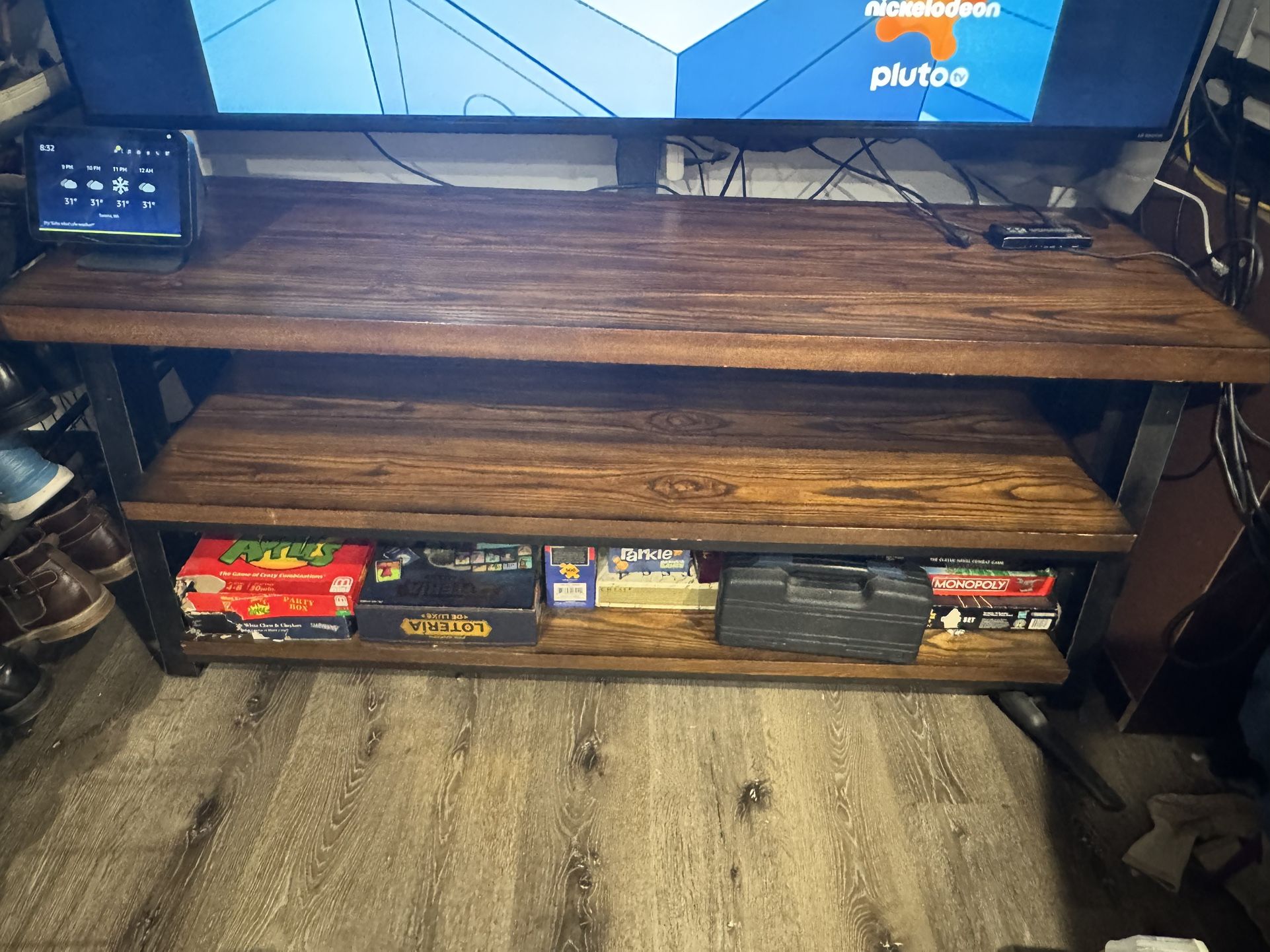 5ft by 18.5 in tv stand, open shelf system and can have the tv on the mounted stand or directly on the shelf, swiveling tv mount, it worked really well with a 65” tv We just got a new entertainment system and don’t need no more Must pick up $150 OBO