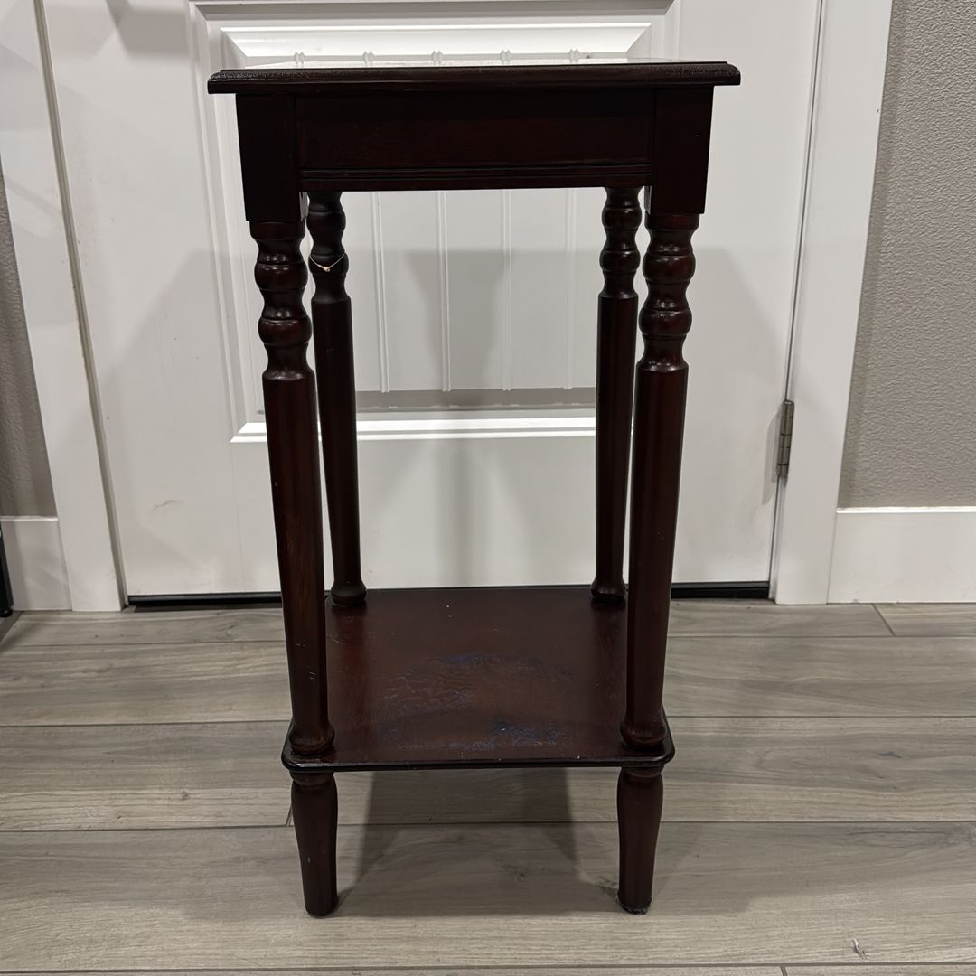 Solid wood end table with a dark cherry finish and lower shelf for storage. Great as a side table, plant stand, or nightstand. Condition notes (priced accordingly): • Cosmetic finish damage on the bottom shelf from a past air freshener leak • Top and structure are solid and sturdy • No wobble, no cracks Damage is not visible from the front and does not affect use. Perfect for everyday use, a plant stand, or refinishing project. Pickup preferred. Cash or ApplePay.