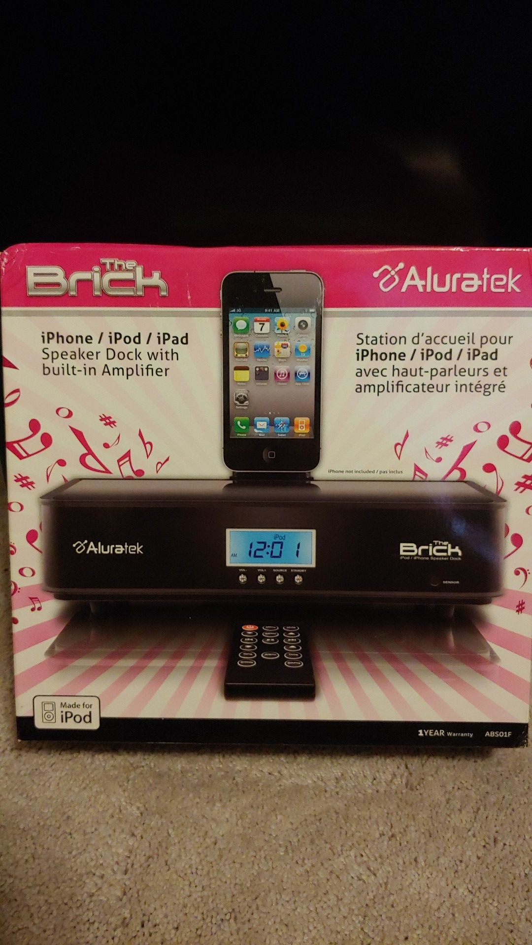 BNIB. Aluratek The Brick speaker dock and clock radio with built-in amplifier. Made for iPhone iPod and iPad.