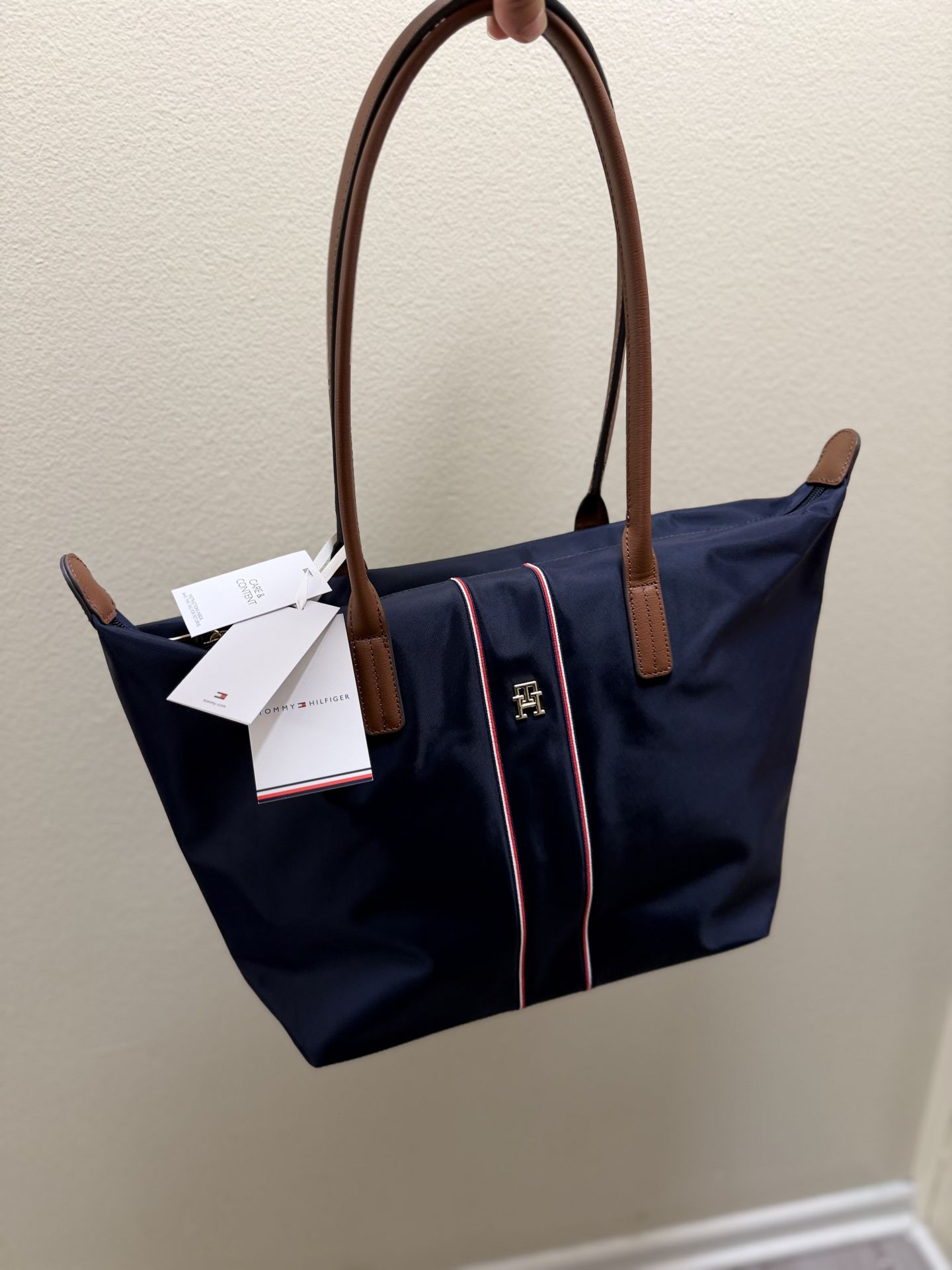✨ Brand New Tommy Hilfiger Tote (with tags) ✨ 👉 “Retail price around $80–$120 — selling for less!” Stylish navy tote with signature red, white & blue stripe and brown straps. Clean, classic look that goes with everything. Lightweight but roomy—perfect for work, school, or everyday use. ✔️ Brand new, never used ✔️ Spacious interior + zip closure ✔️ Authentic Tommy Hilfiger Selling for less than retail—great deal 🔥 Message me