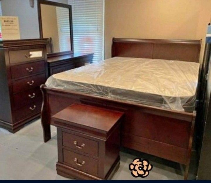 Best OFFER 🔥Louis Philip 3 Cherry Sleigh Bedroom Set Bed, Dresser, Nightstand and Mirror