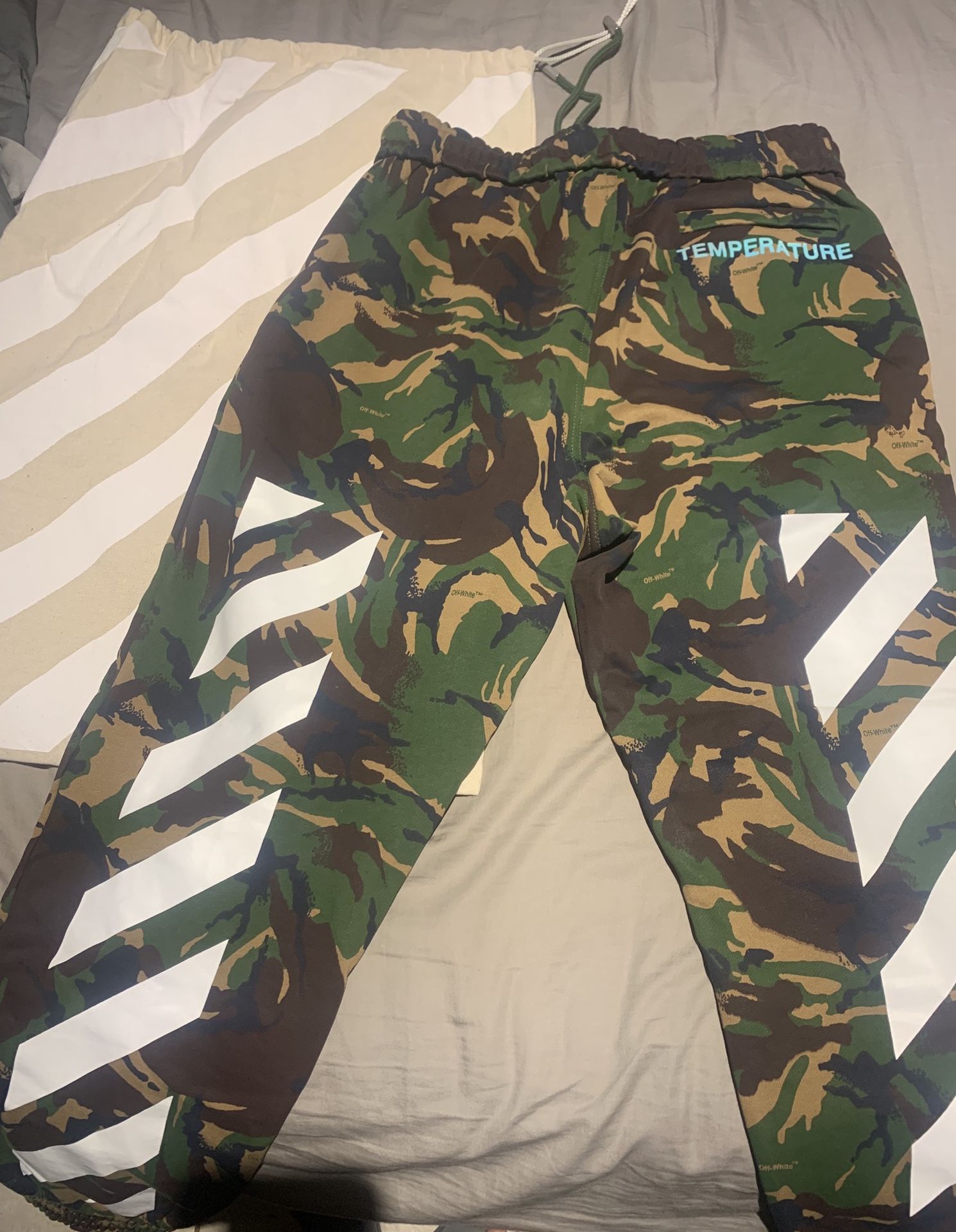 off white camo pants with duffel bag size small fits 30-36 waist! Taking cash offers or willing to trade ...
