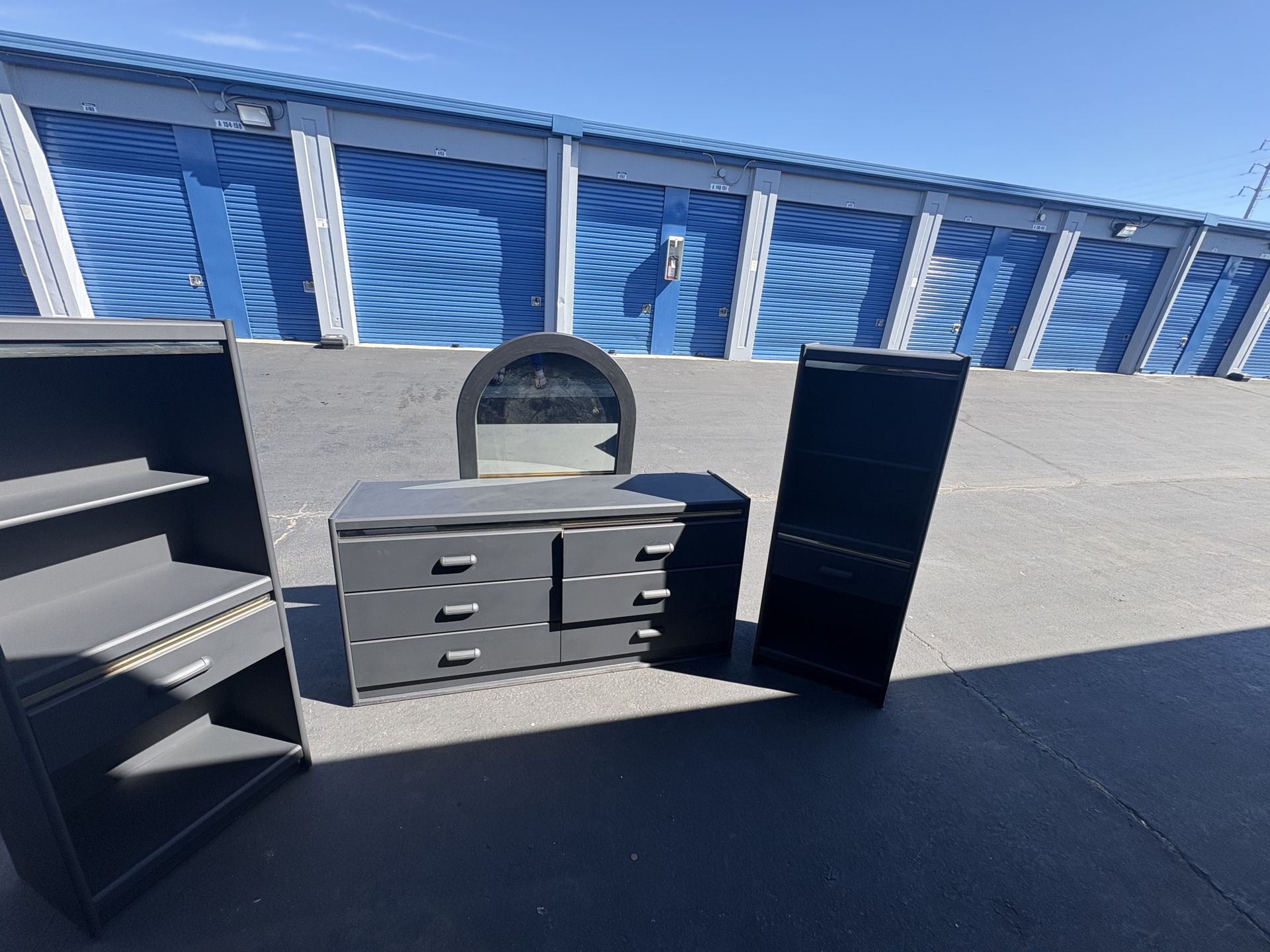 Nightstands: Length:21 in Height: 54 in Width: 14 in Dresser: Length: 60 1/2 in Width: 16 3/8 in Height: 30 in Mirror: Height: 41 1/2 in Width: 29 1/2 $250 firm for entire set no holds must be picked up before the weekend Color; Dark kettle black with gold accents