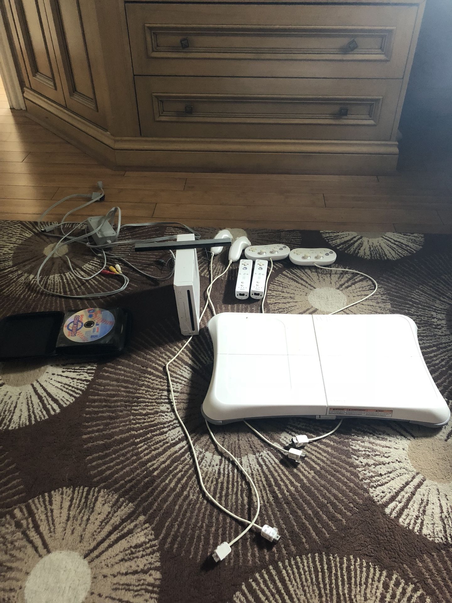 Comes with 2 controllers,2 nunchucks, 2 classic controllers, a Wii fit, and 20+ games