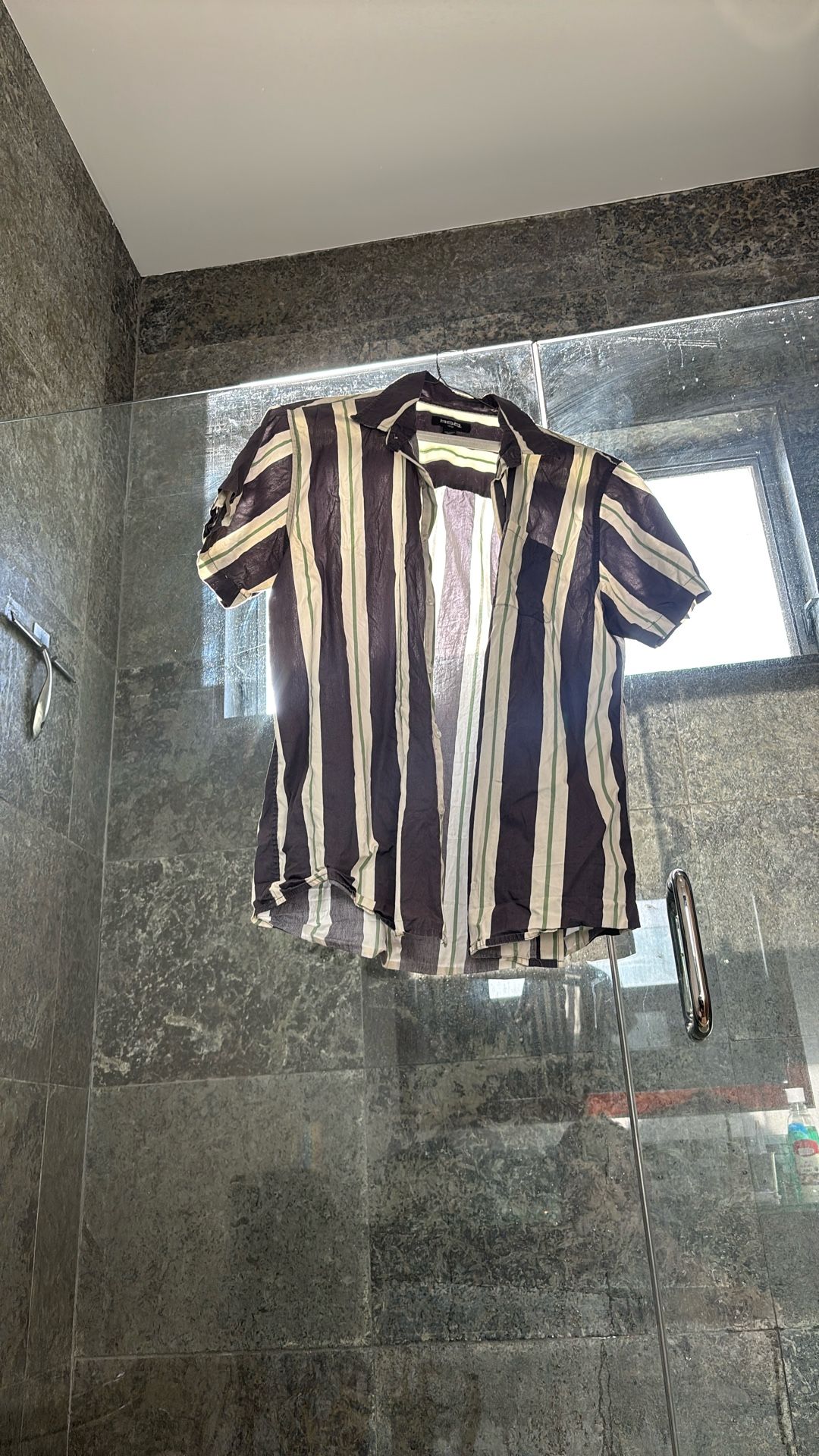 Lightweight short-sleeve button-up with vertical stripe pattern in brown, cream, and olive tones. Features a relaxed fit, open collar, and breathable fabric—great for warm weather, casual outings, or beach/party wear. Stylish retro/vintage-inspired look that pairs well with jeans or shorts. Good condition.