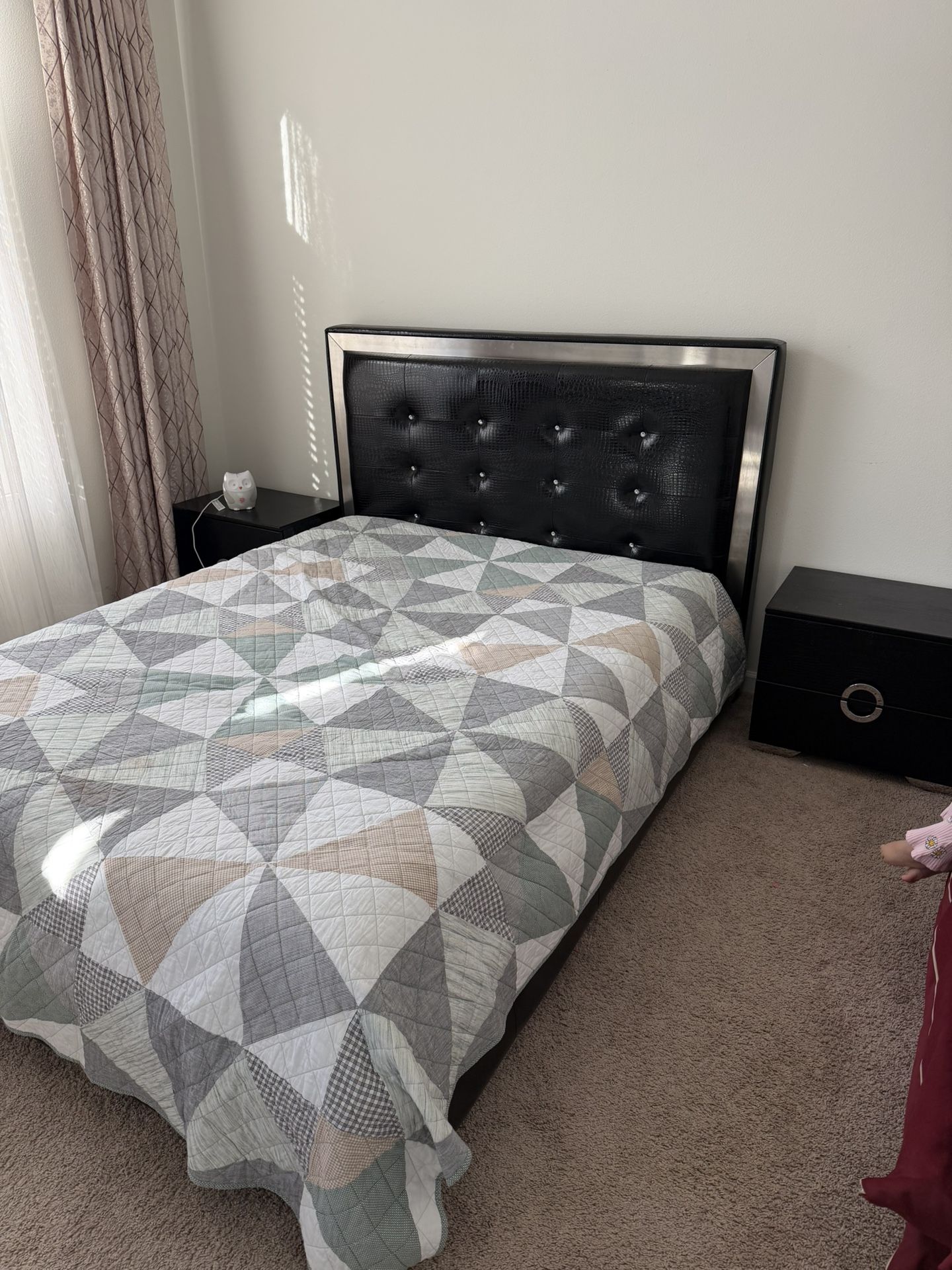Modern black queen bedroom set in great condition. Set includes: ✔ Queen bed frame with padded tufted headboard ✔ 6-drawer dresser ✔ Large matching mirror Elegant black finish with silver accents. Very solid and heavy — good quality furniture. Clean home, no pets, no smoking.