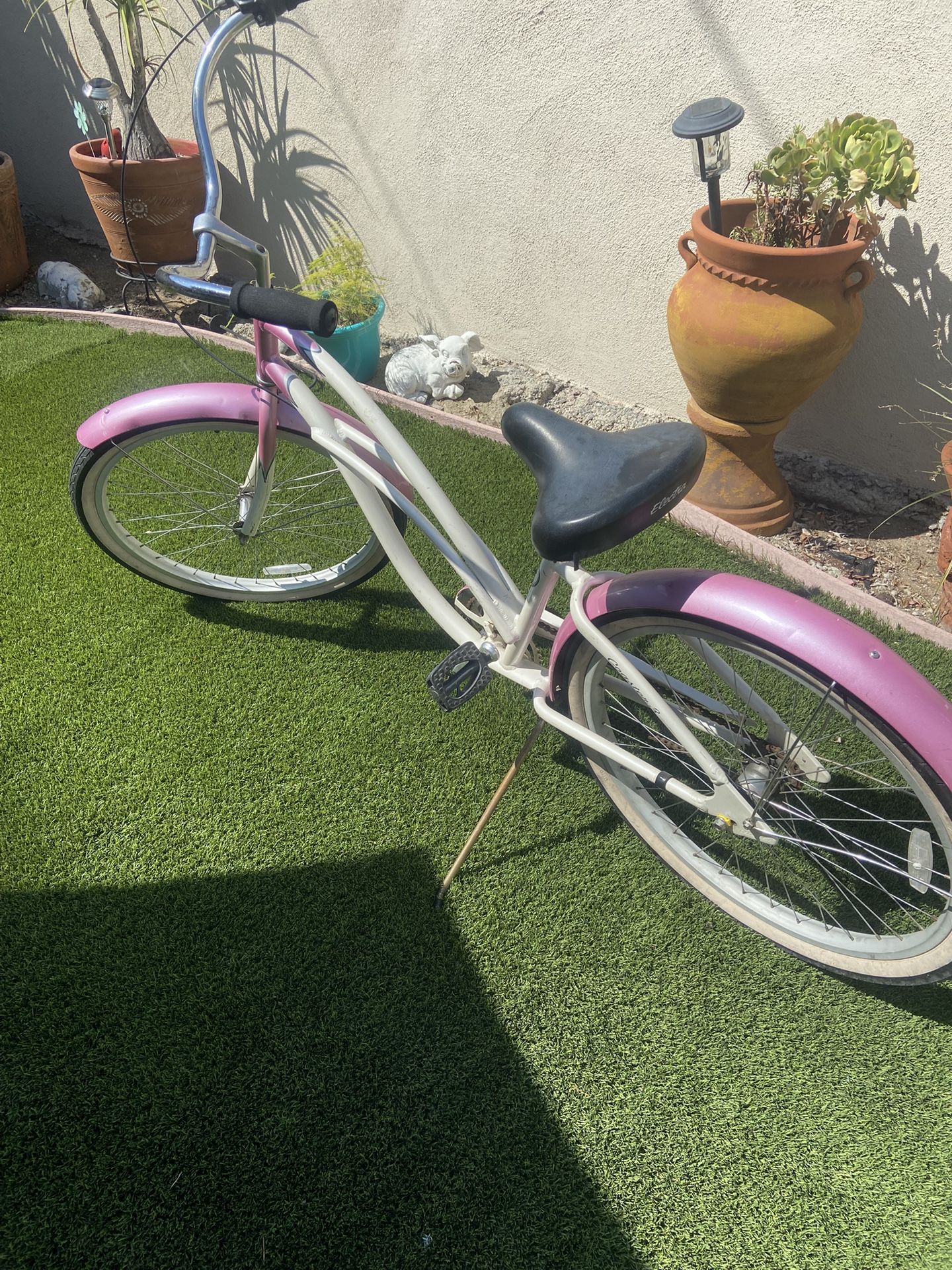 Electra pink and white 3 speed, nexus gears. Used condition. Tires hold air but they are worn.