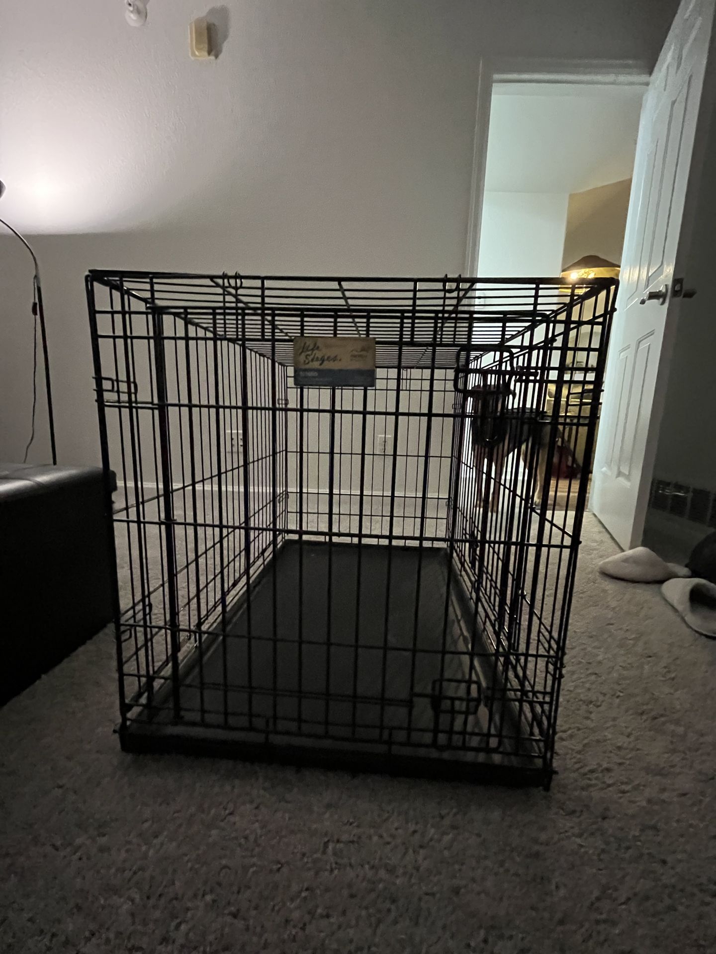 Black metal dog crate with a washable bottom and two doors that open and close. Good condition, no damage. My dog is 40-45lbs and had plenty of space. Collapses for easy storage and transport.