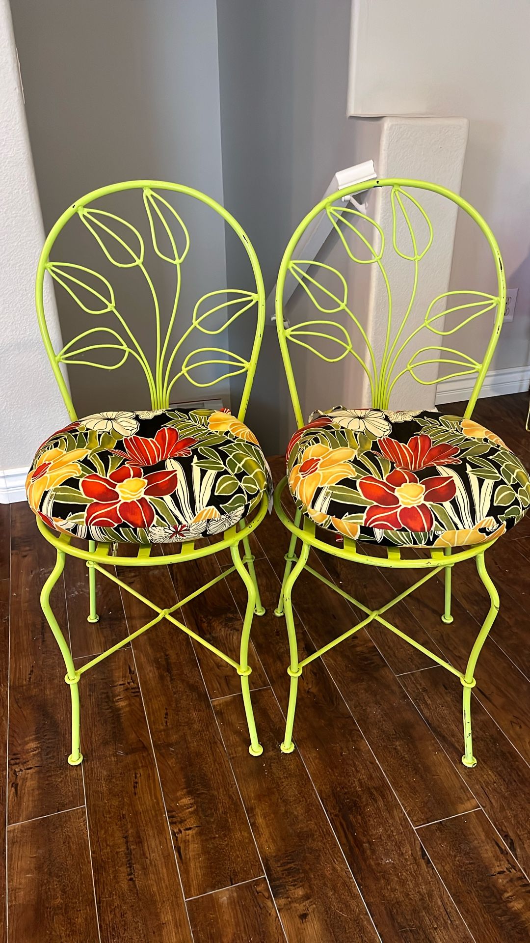 Here are a Pair of Patio/ Parlour Chairs in Rod Iron (Pair) Comes with or out Custom cushions . Price is Firm