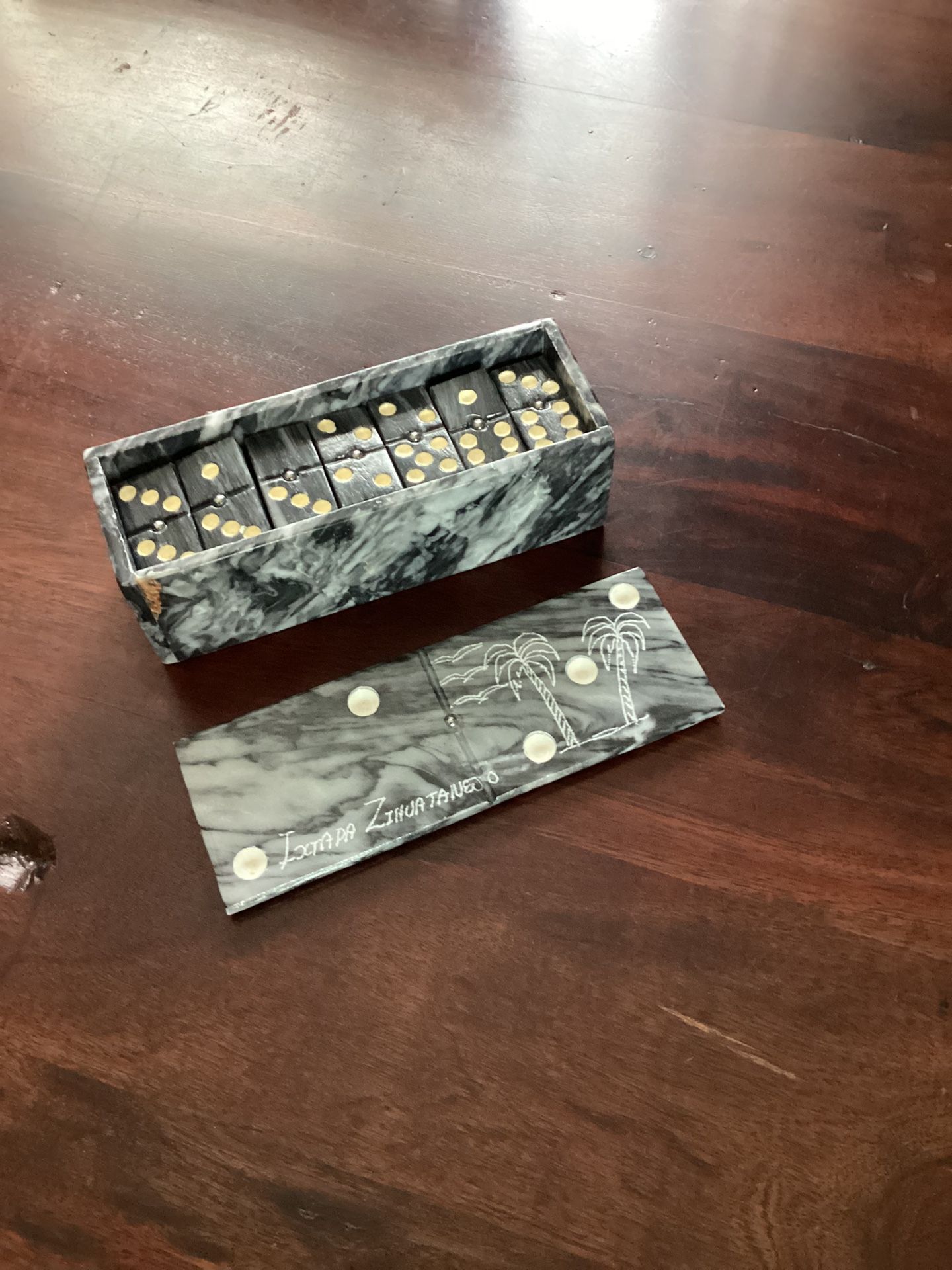 Miniature Marble Domino Set dark grey & White Stone, with storage box. excellent condition.