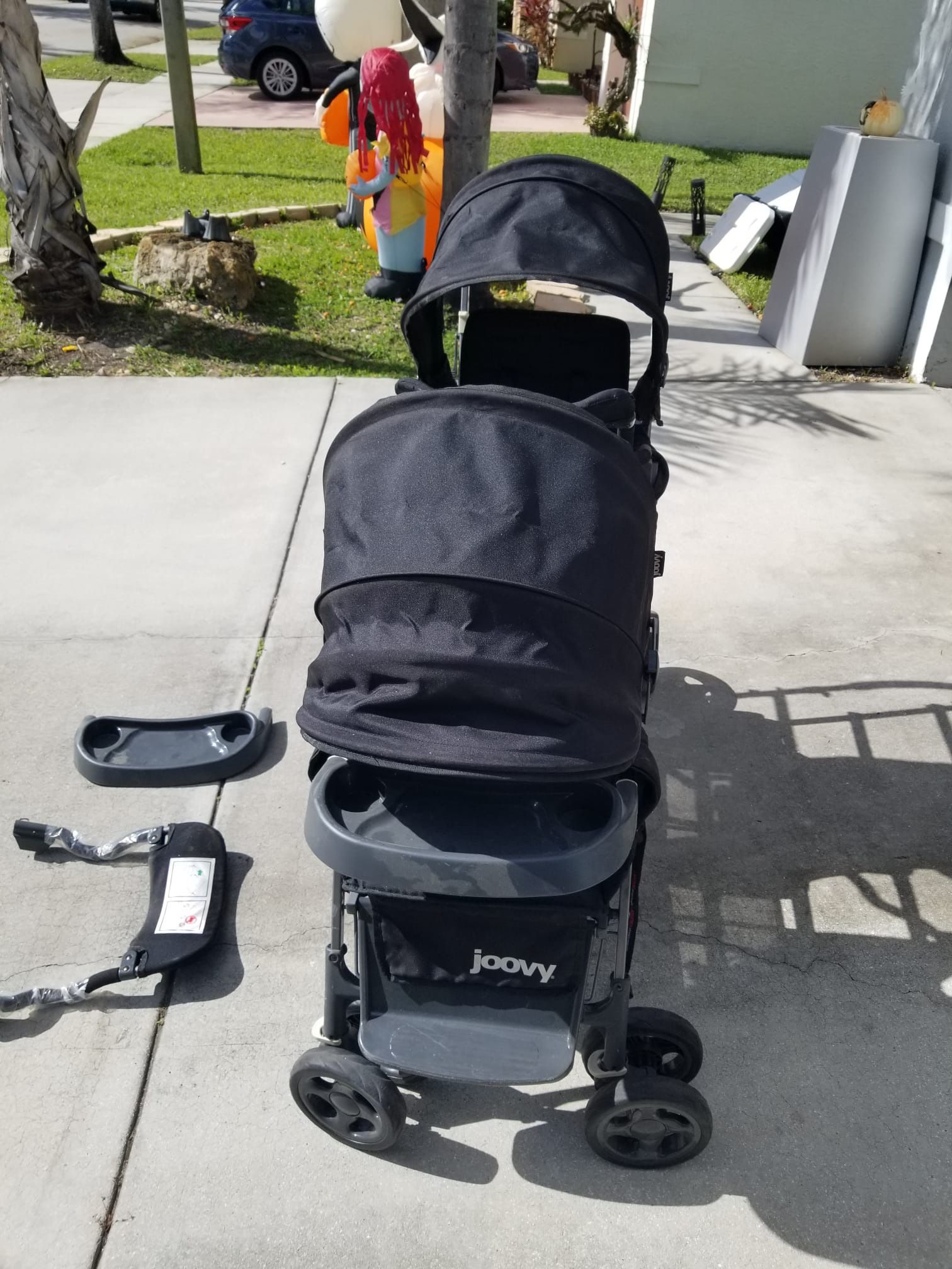 Joovy my big stroller for 3 children(3 sets of seatbelts). has 2 detachable tray/cup holder, 2 detachable car seat bars, and 2 tarps for forward looking children. Big bottom storage, rolls great/smooth. (2 kids looking forward, one looking back OR 2 car seats looking back and child looking back) my 8 year old can still sit in back looking seat and my 5 year old can still fit in either of the front looking seats. Great stroller still pretty much new (just dusty) my lil ones no longer need corraling lol so honestly not necessary anymore . Breaks down very easily and put back up just as easy my wife is 5’7” and can easily manipulate it. Rubber wheels not air so more reliable and don’t need to fill up wheels regularly. Questions please ask