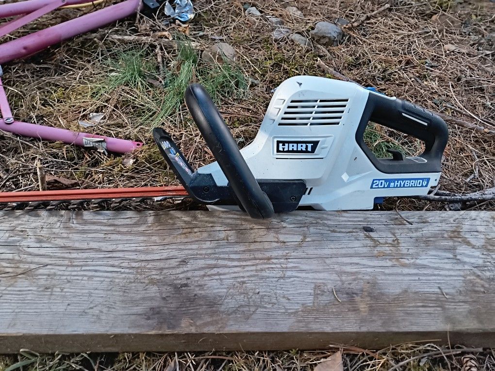 Hart hedge trimmer. Hybrid. 20v cordless or 120v AC. Sharpened blades. Runs fine. Tool only. no holds. pick up