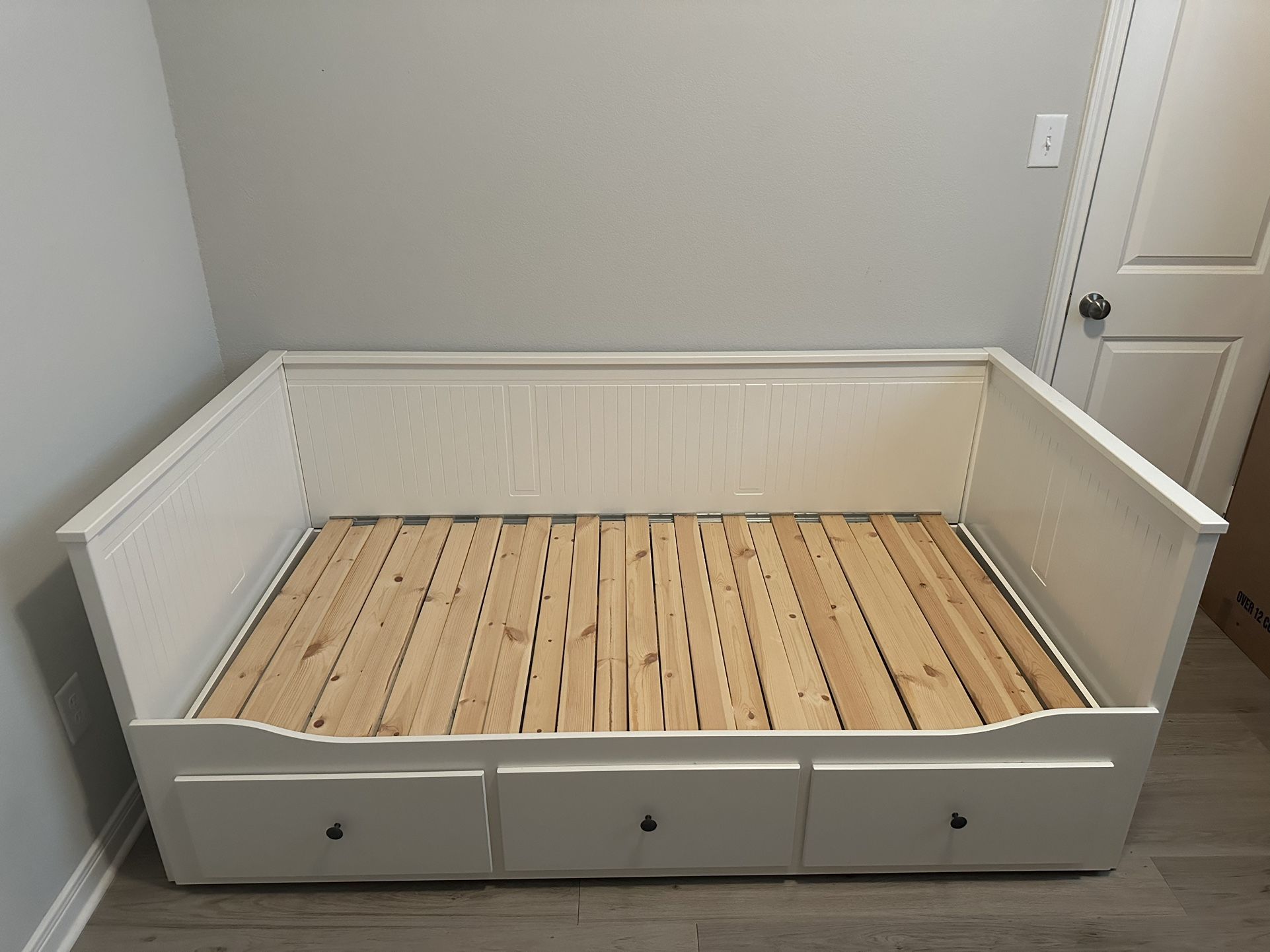 Used white wood IKEA Hemes convertible daybed. Transitions to a full king size bed with three drawer storage underneath. Used, good condition, non smoking home