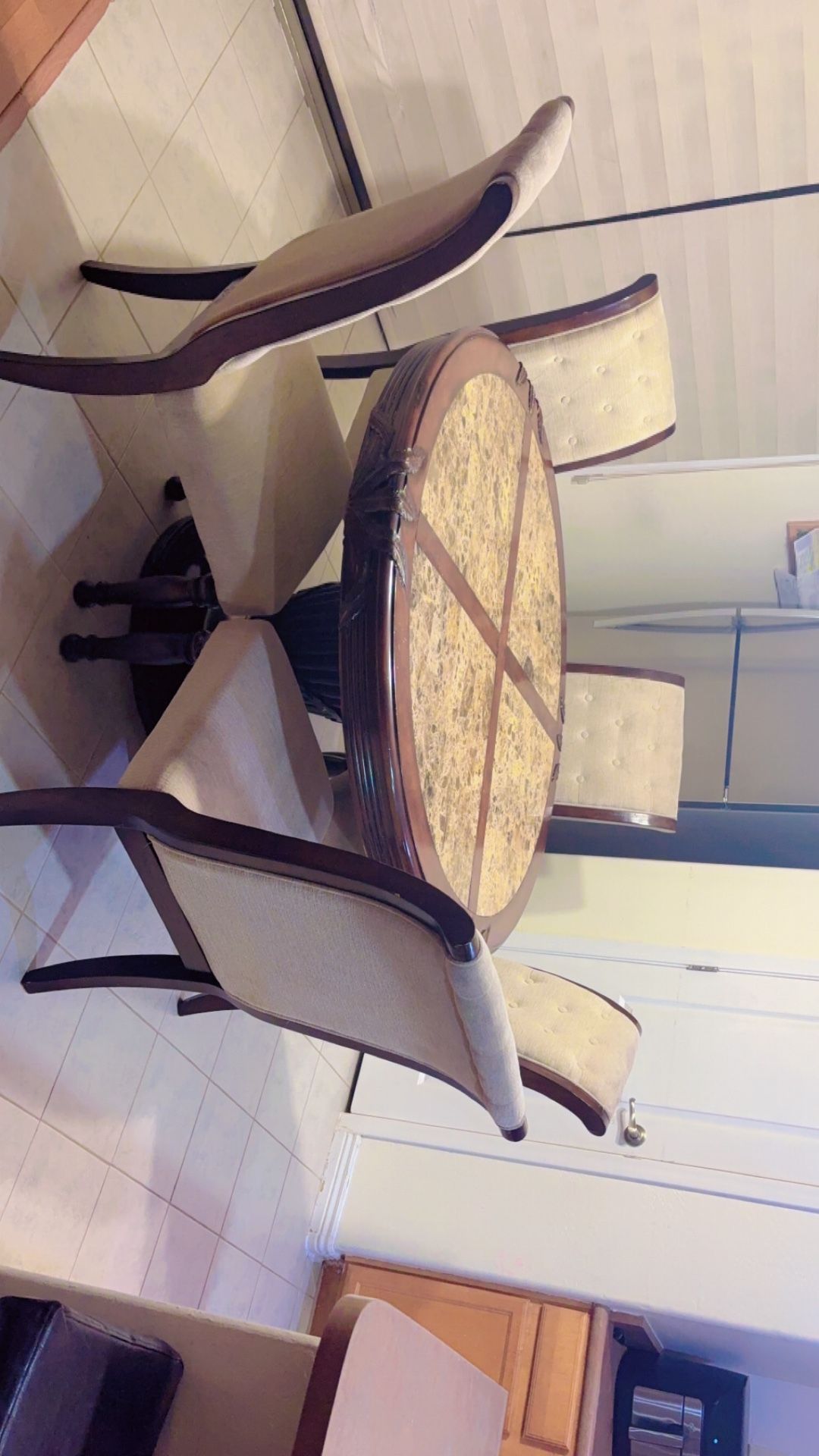 cream/coffee-brown circular wood and marble dining table from Ashley Furniture elegant and classic design. It features a sturdy dark wooden frame with gently curved legs and a slightly arched backrest. The seat and back are upholstered in a light beige or cream-colored fabric, providing a soft contrast to the dark wood. The backrest is tufted with button detailing, adding a touch of sophistication and comfort. Overall, the chair combines a traditional look with modern comfort, making it suitable for a formal dining room or a stylish kitchen setting.