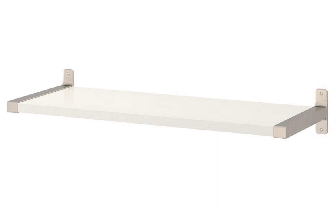47” long white shelf with stainless end brackets. White melamine is in very good condition with one side slightly better than the other.