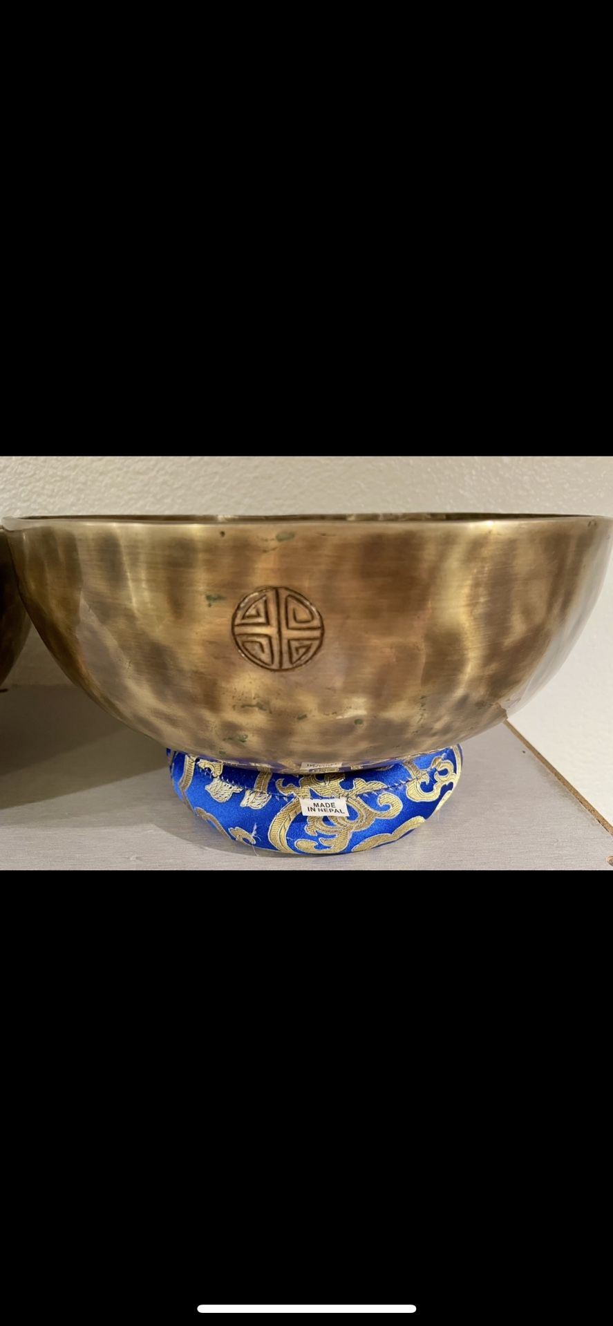 100% Handmade traditional Tibetan singing bowl What makes this instrument so special? Only about 8 out of 100 singing bowls are suitable for professional sound healing and sound meditation. Due to the ever-increasing price of metals on the market, most bowls today are made from metals such as brass or cheap aluminum, with a nice coating so that they all look the same to the customer's eye. The craftsmen used copper, tin, lead, zinc, iron and finished this bowl with silver and real gold. This instrument was hand hammered making it a one of kind, unique piece of art work. This specific bowl communicates with all energy centers in the body (chakras) and is specifically tuned to the note “A” corresponding to 384 & 426.7 Hz frequencies: Third Eye & Throat chakras energy centers Tibetan System: Throat Chakra Vedic System: Third Eye Chakra Tibetan (Nepal) System utilizes systems of the fifth. Vedic System utilizes diatonic scale. Tibetan Singing Bowls have been used for centuries for healing, meditation and medicine. Singing bowls produce a range of vibrations to restore the frequencies of diseased and out-of-harmony parts of the body, mind and soul. EDUCATE BEFORE YOU BUY: This is a professional healing instrument. This instrument was not made in a factory. This singing bowl was hand-hammered in Nepal, making this bowl a unique work of art and truly one of a kind. Beautifully hand carved with the famous mantra, “om mani padme hum,” and the Eastern South Asia longevity symbol, sometimes known as “Shou.” This singing bowl was hand chosen carefully from Nepal and tested by Nepali healer, Aman Shahi, nephew of Jit Bahadhur Shahi, and personally brought to America from Chiang Mai, Thailand. The thicker rim on this hand-hammered bowl makes its vibrations intensely strong and long lasting. This singing bowl is potent for on body vibrational healing and is very effective for individual and group sound healing treatments and meditation sessions. This bowl was used by me (2020-2025) to heal my clients utilizing the Swoyambhu Method. Benefits of Tibetan Bowl Therapy: Reduce stress and anxiety Lower anger and blood pressure Improve circulation and increase blood flow Deep relaxation and pain relief Chakra balancing Increases mental and emotional clarity Promotes stillness, happiness, and well-being Stimulates the immune system Removes blockages and toxins from the body Helps you to connect with your higher self Balances both hemispheres of the brain Since healing to all cells of your brain Help helps to recover after an illness, traumas and medical treatment Please note after performing Tibetan Bowl Therapy, effects will last for several days, increasing deeper, more restful sleep. After use, it is crucial to stay well hydrated. This bowl can be used for sound and vibrational healing. When using the bowl on body, (vibration healing) it is an internal massage for the cells and energy centers. Ethically & Morally Responsible: These bowls are very powerful and must be used with caution and extreme care. Consult your doctor prior to use. Not suitable for those with Pacemakers, Stents and other internal metal devices. Do not wear metals when using. Do not wear jewelry when using. Kindly Research Prior To Your Inquiry: Law of Vibration Brainwave states (Delta, Theta, Alpha, Beta, Gamma) Binaural Beats Monaural Beats Cymatics Dr. Masaru Emoto
