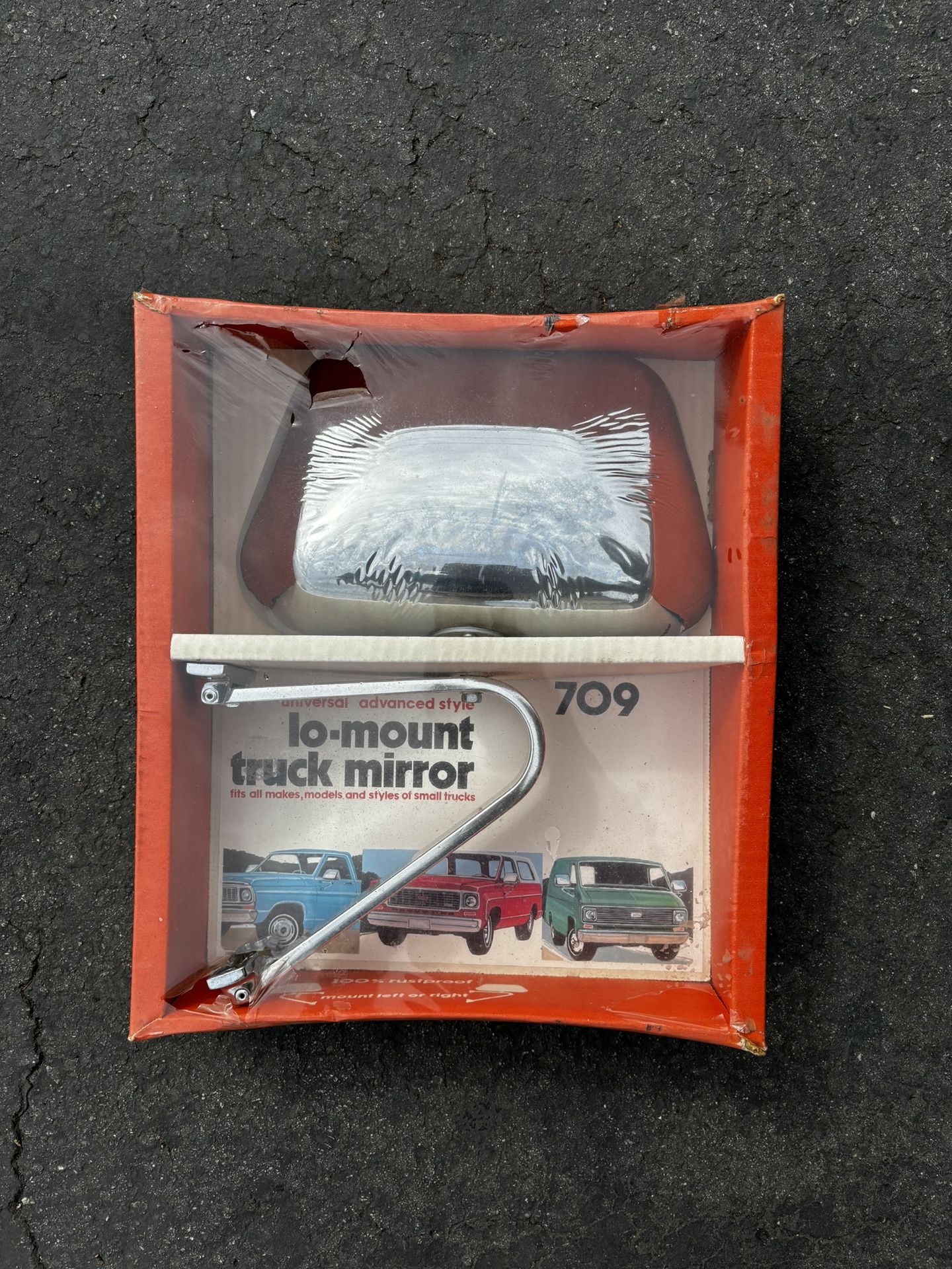 Universal truck mirror left or right either one Brand new sealed in box dead stock Rare find great priceFord mirror Chevy mirror C10 mirror F150 Bronco Blazer Kc mirror