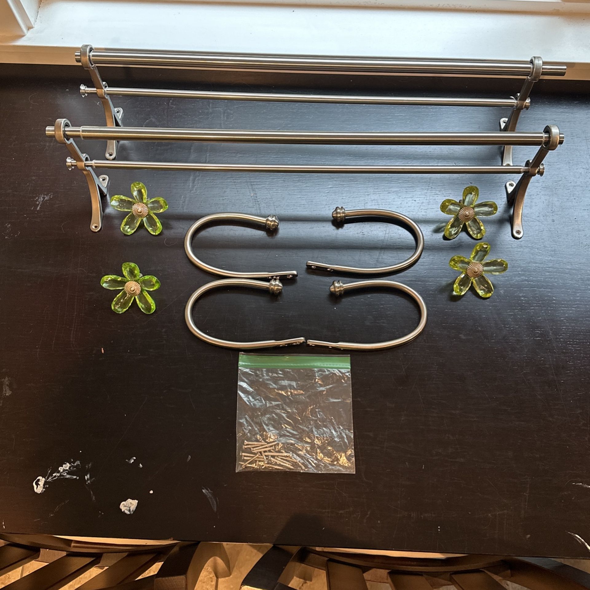 This is a Pottery Barn Kids curtain set for two windows. This is a unique set that holds two sets of curtains per window - a translucent set that lets light in while giving privacy and a blackout set that makes the room cozy and dark. Each window set contains two curtain rods with mounts and two curtain holdbacks, all in brushed nickel. The finials are delicate green glass flowers. The curtains consist of two lavender silk blackout curtains and two translucent sheer curtains with butterflies. The curtain panels are 44” wide x 63” long All the screws needed to mount the hardware are included.