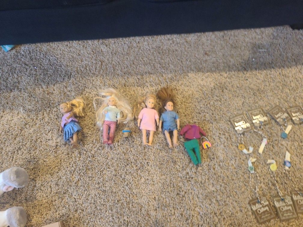 This is a set of 4 Lori Dolls from Our Generation. They are the small dolls that are 3-4 inches. It also has an extra outfit.