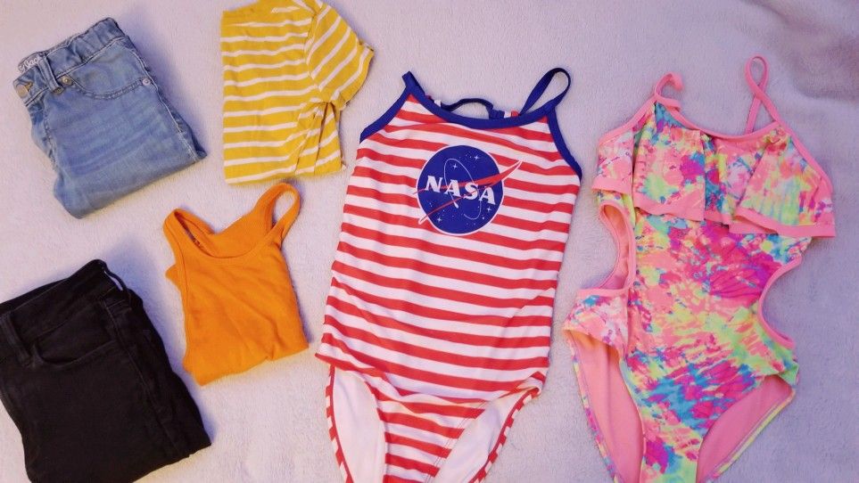 Excellent condition, nice and clean American Eagle Blue Jeans Size 10: $7 Cat & Jack Size 10 Black Jeans: $7 Yellow & White Shirt Size 8: $5 Orange Tank Top Size: Small: $5 NASA Swimsuit Size 10-12: $6 Tye Die Swimsuit Size 12: $6 Total Bundle Only $30.00