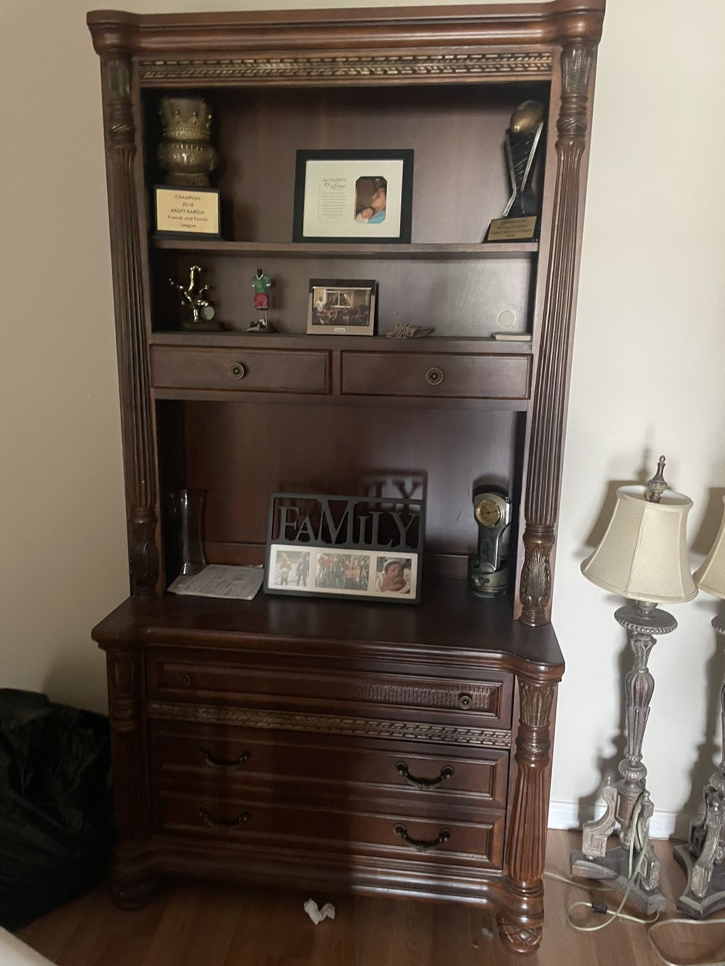 Wooden two piece shelf with file cabinet. 75 or best offer. Moving and need Gone asap