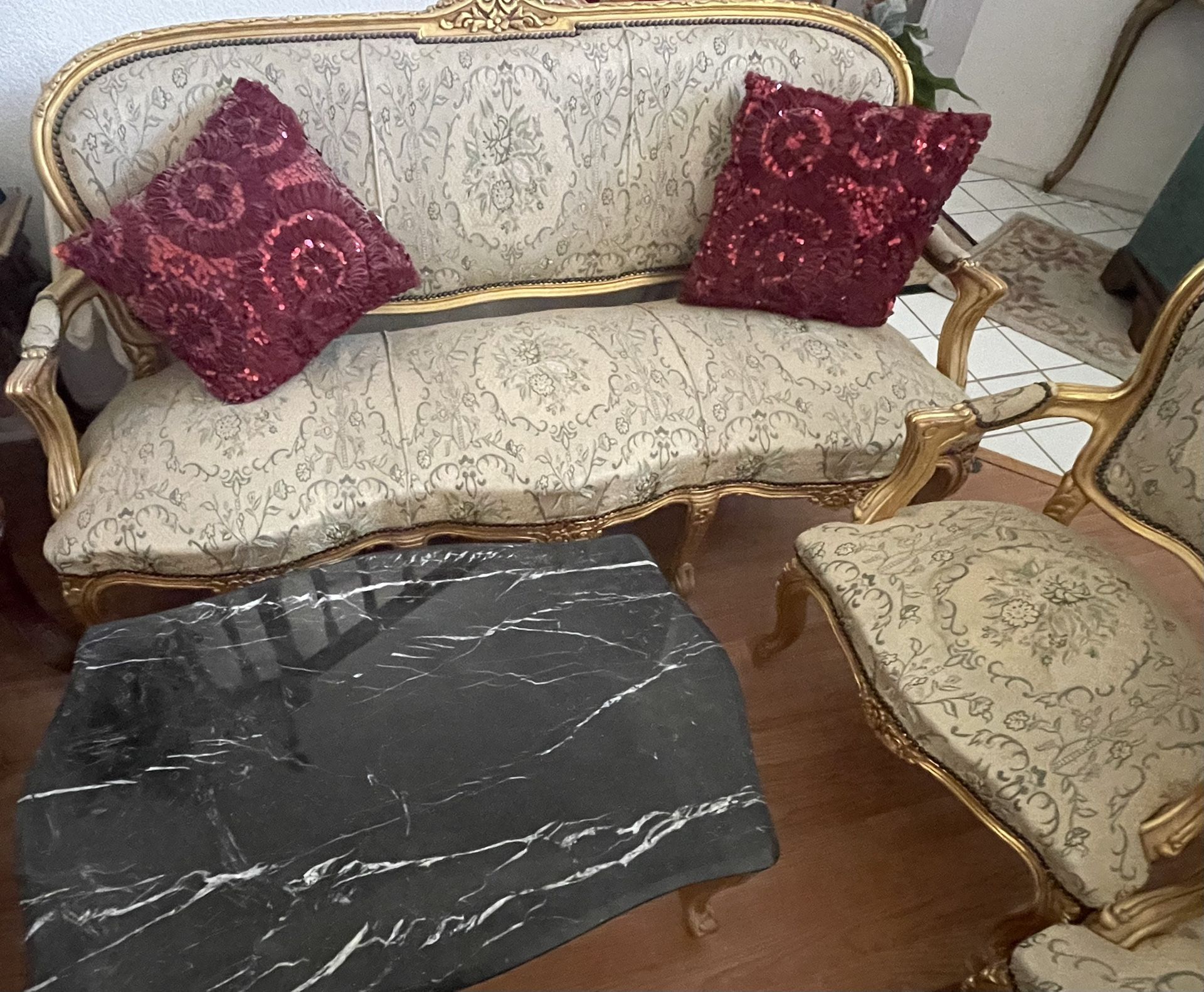 Gold Italian style living room set: one sofa, one table, 4 chairs Great condition